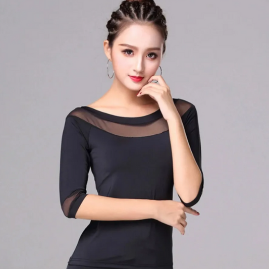 Black Latin or Ballroom Practice Tuck Out Top with Half Sleeves and Mesh Accents for Girls and Women PRA 1093_sale