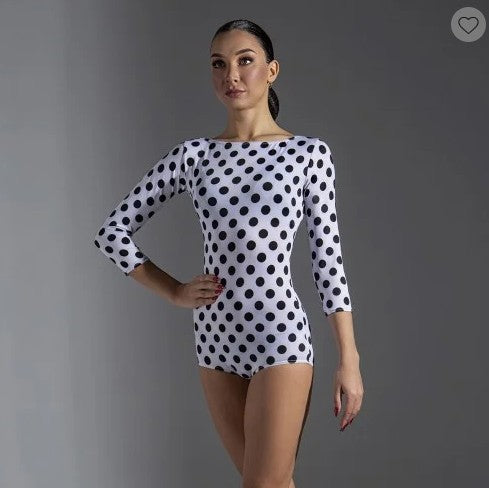 Women's bodysuit, with a three-quarter sleeve, a boat-shaped neckline in front and an open back, with a button fastening at the bottom. The product is made of oil jersey, velour stripes are sewn on the shoulder and sleeve.
