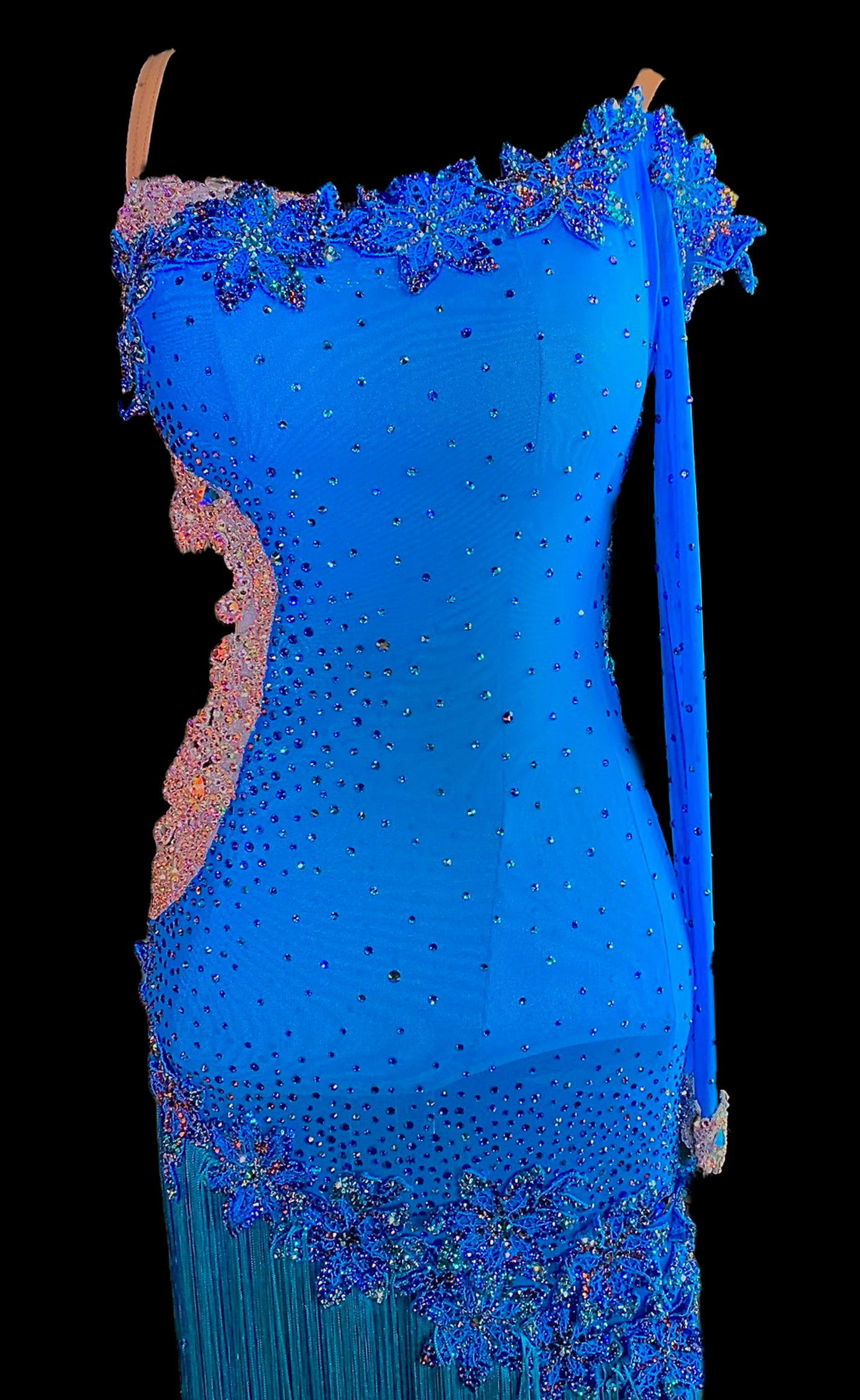 Electric Blue Latin Costume Dress with Single Long Sleeve, Swarovski Stones, Lace Appliqué, Open Side and Back, and Asymmetrical Fringe Skirt Size Small Lat154