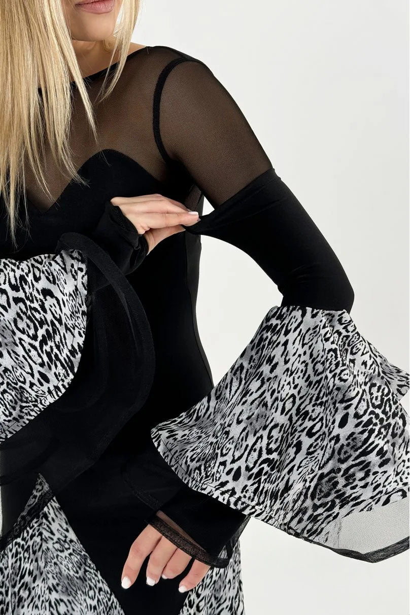 Material: jersey, soft mesh, silky costume fabric with gray print