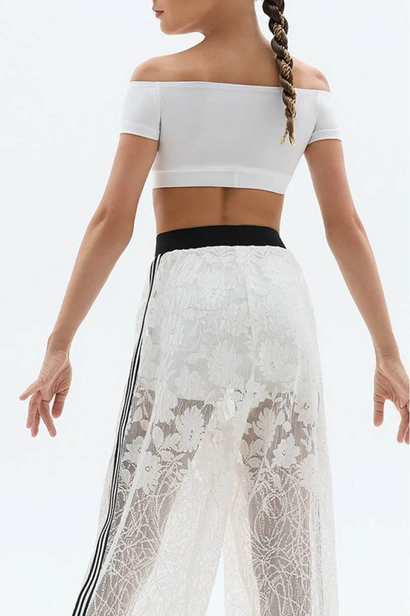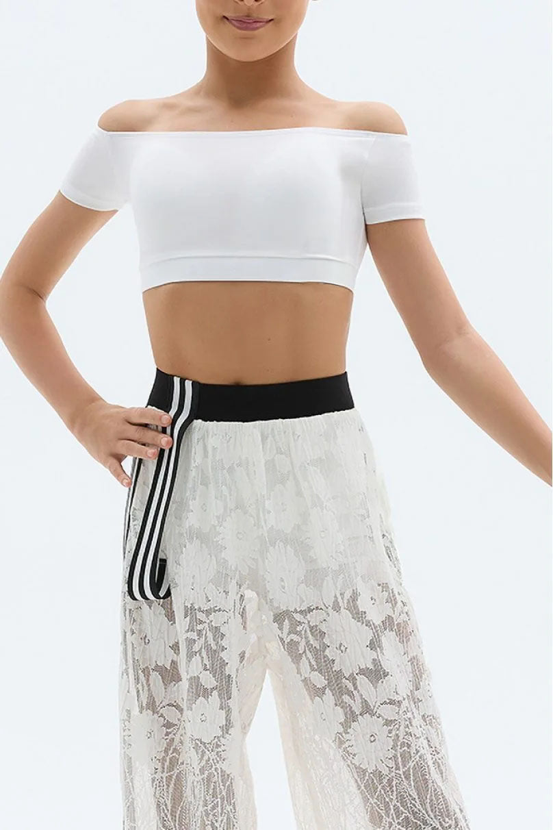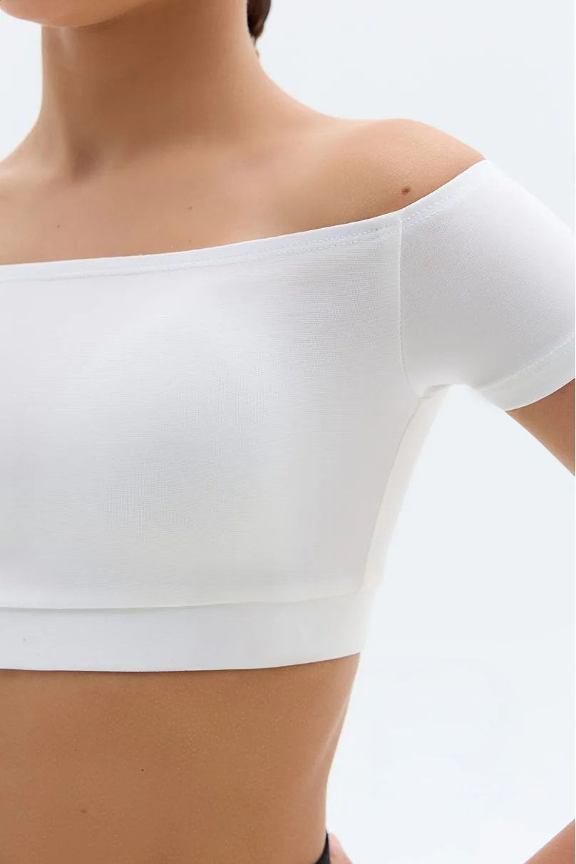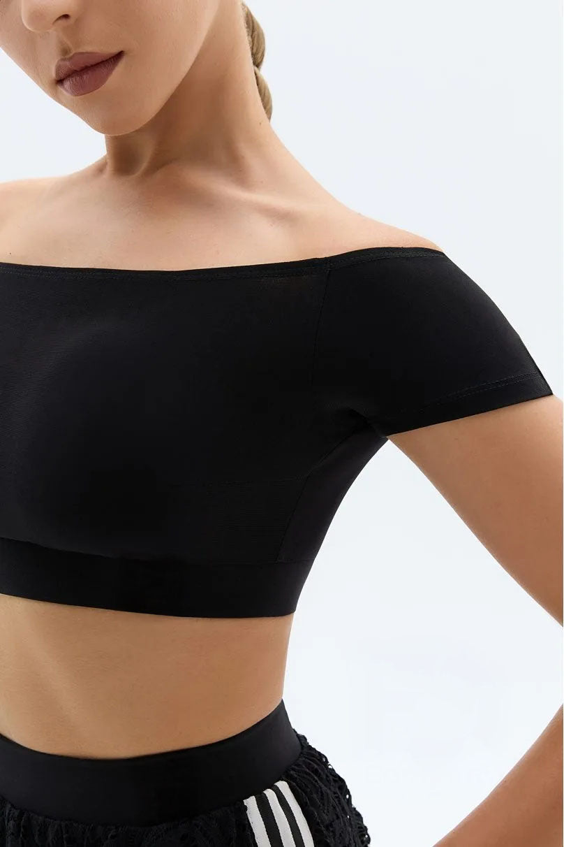 Latin Dance Top — a fitted model with short sleeves and open shoulders, designed for a sleek silhouette. The bottom features a 3–4 cm elastic waistband for a secure and comfortable fit.