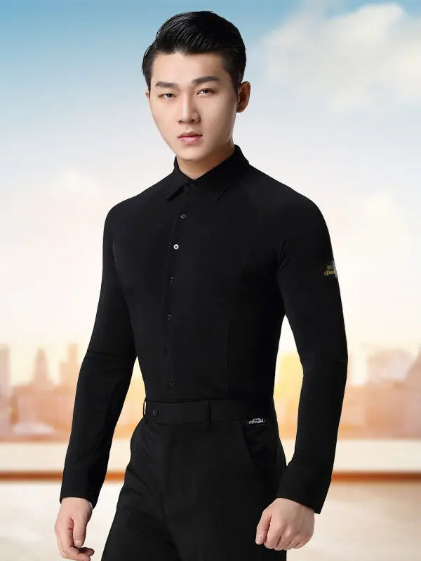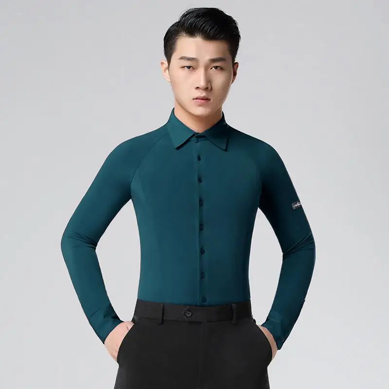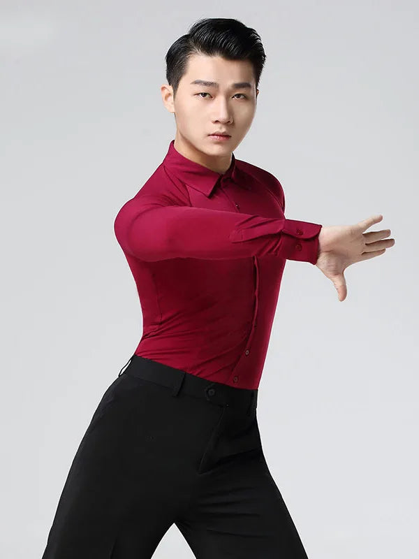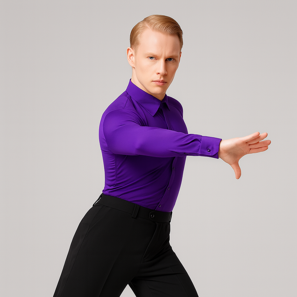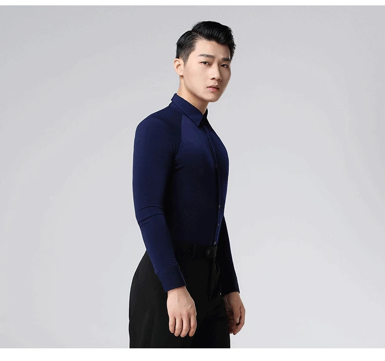 This amazing ballroom shirt features long sleeves and a tuck out design. There are no trunks on this shirt, making it super versitile. It comes in mamy colors options. The fabric is a breathable sogt crepe, which means no ironing.