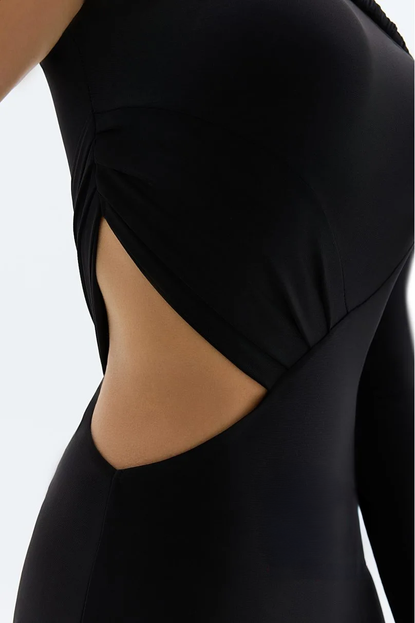 Latin dance dress — a fitted model with a one-shoulder design and long sleeve. The top features a wide strap with a yoke, while draped pleats on the front and back add texture and refinement.