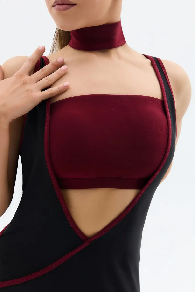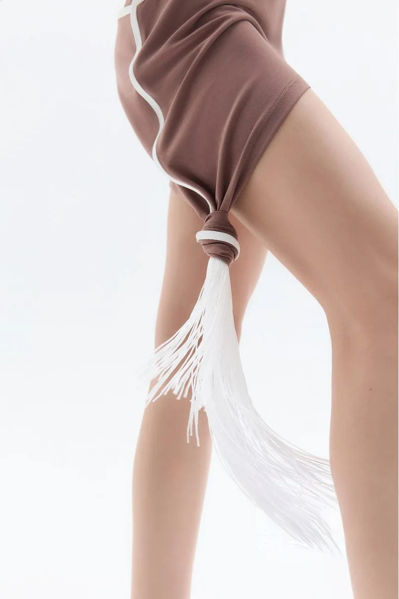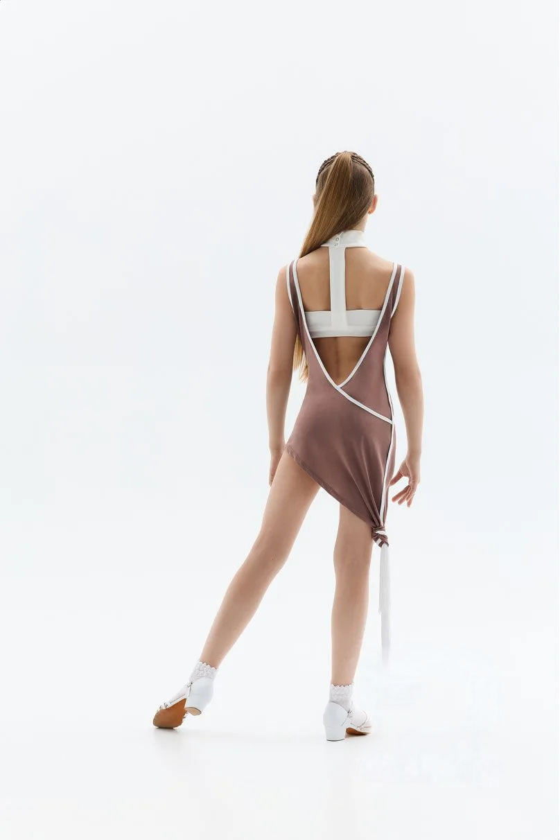 This vibrant two-piece set is designed for Latin American dances and features a fitted top paired with a loose tunic. The tunic has a deep V-neck and back, accented by a decorative fringed belt. The fitted top boasts a unique back design and forms a stand-up collar with a snap button closure. Additionally, contrasting piping made from decorative fabric enhances the overall look.