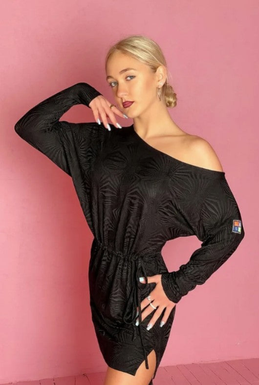 The women's dance mini dress features a loose-fitting top with a wide neckline and exposed shoulders. Its wide sleeves create a stylish batwing effect. The mini skirt has small slits on the sides and a thin belt that cinches at the waist, beautifully accentuating the figure. This dress is made from a soft, structured jersey fabric for comfort and elegance.