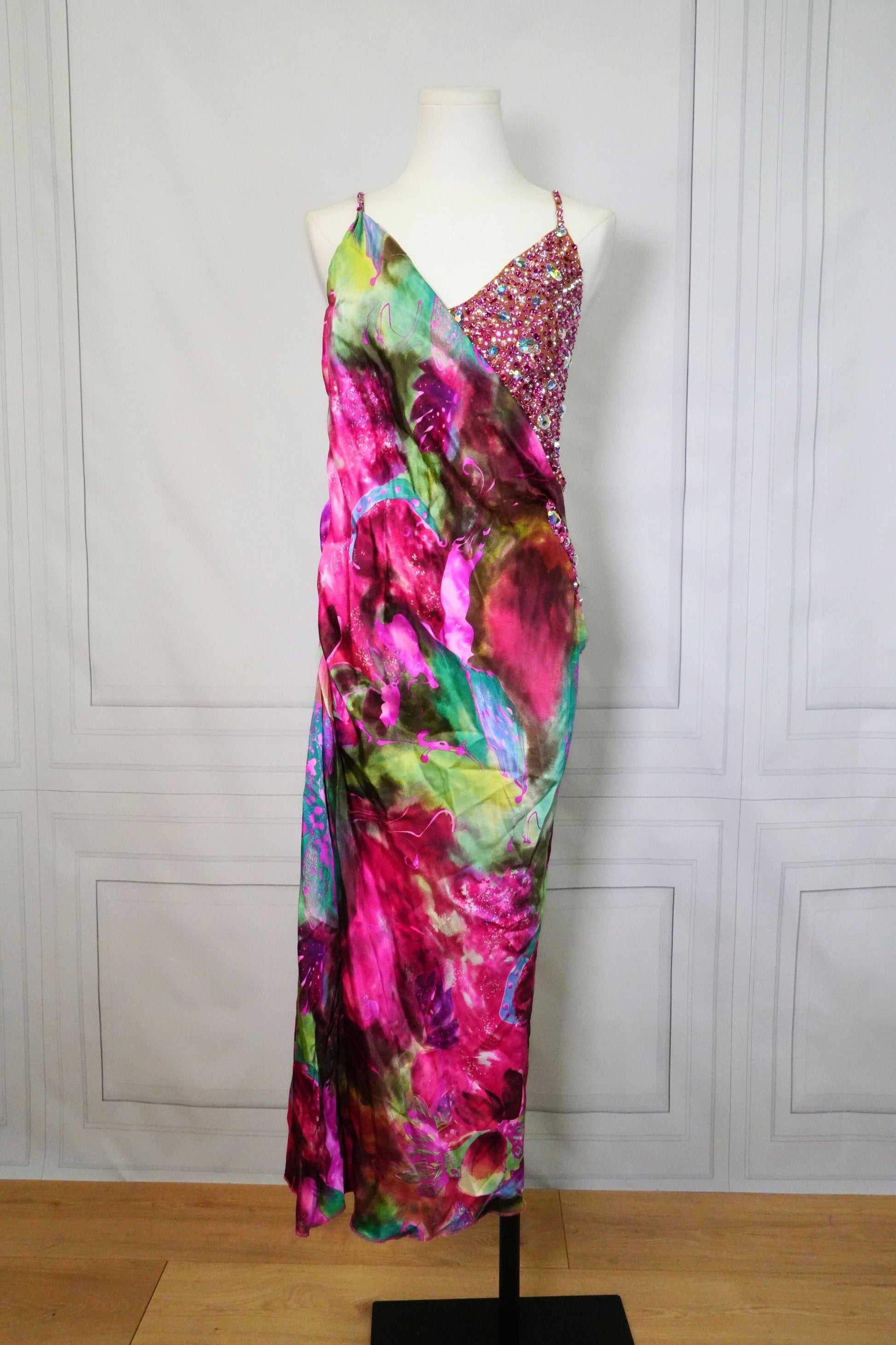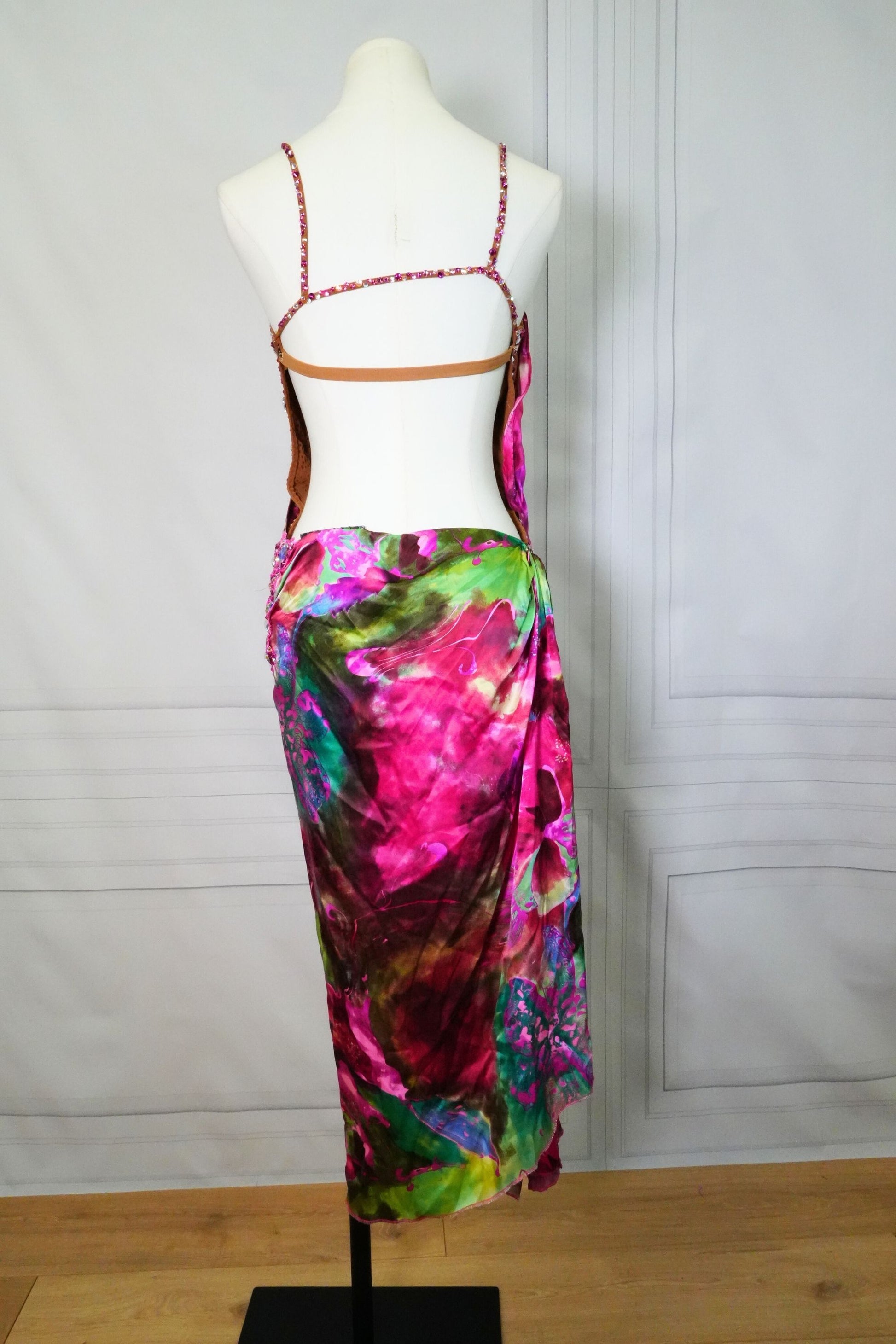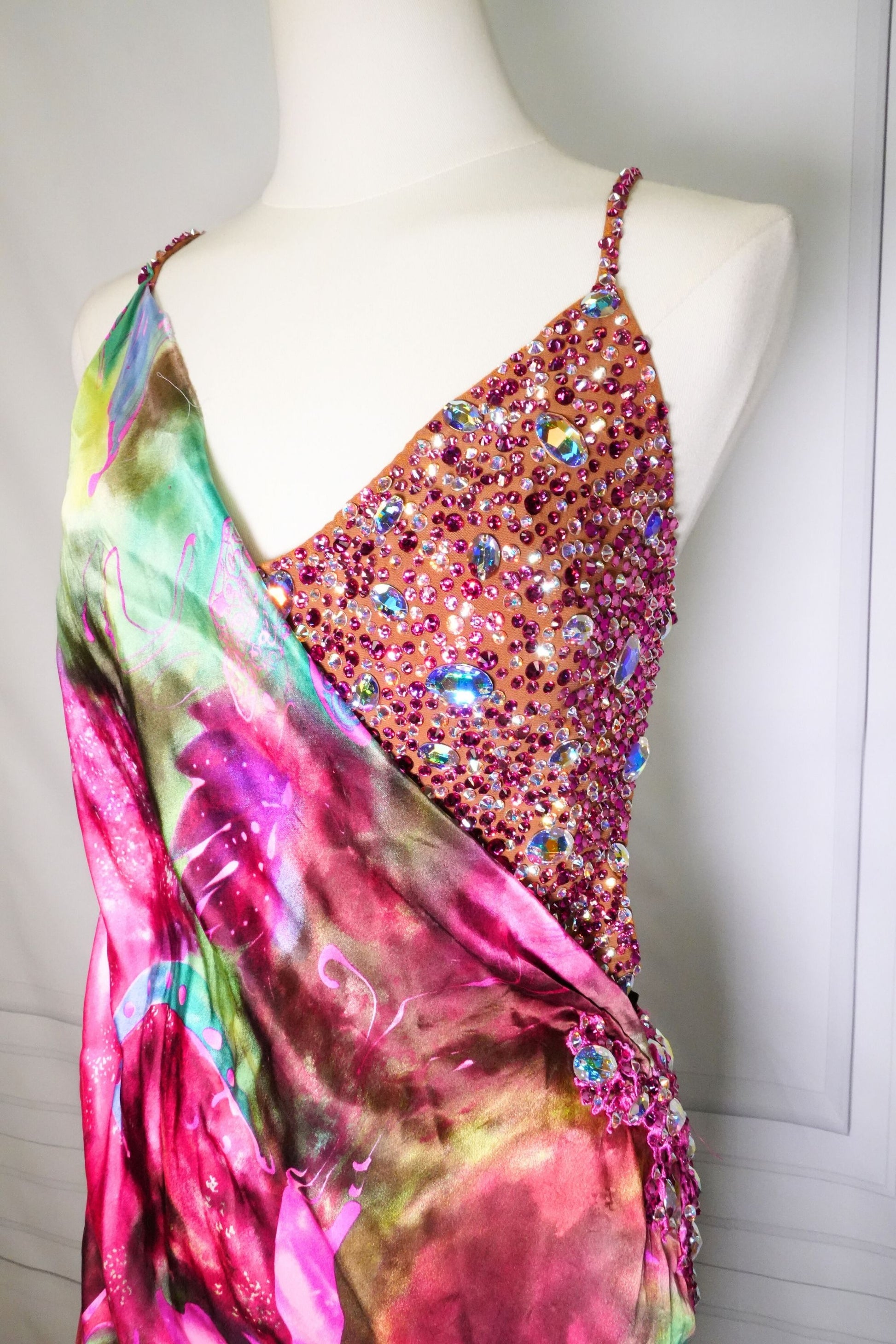 Resale Fiore Latin/Rhythm Dress with V-Neckline, Tan Bodysuit, Pink Silk/Satin Wrap Skirt, Swarovski Stones, and Open Back Size Small Lat166