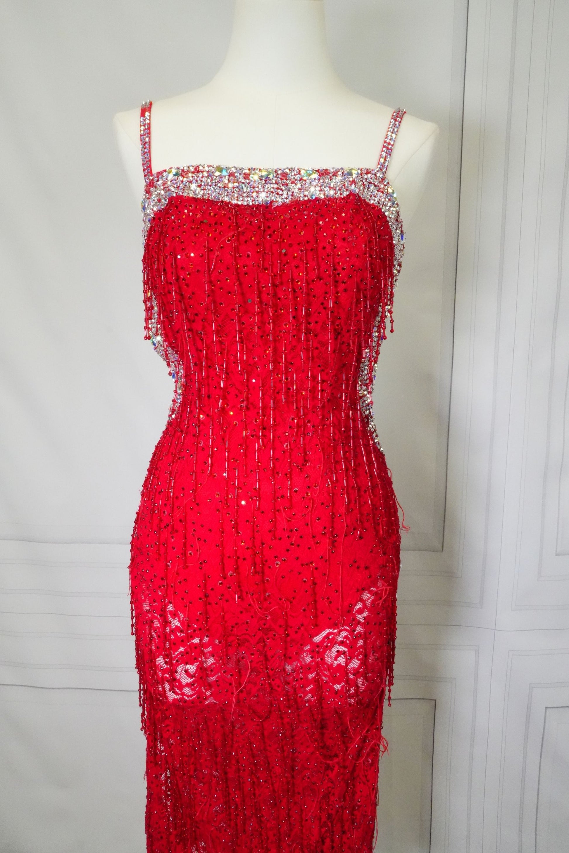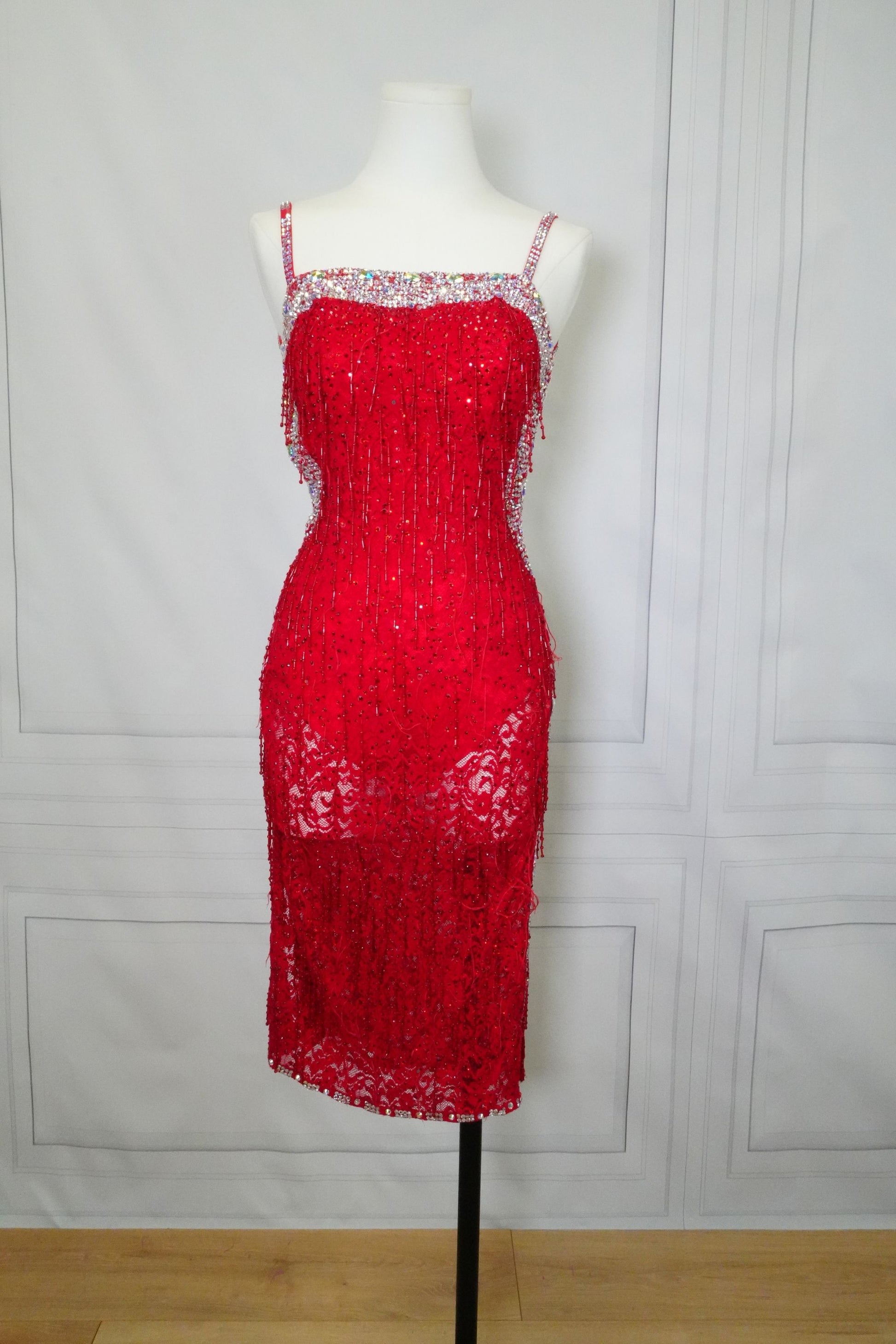Red Lace Latin Dress with Thin Shoulder Straps, Stones, Open Back, and Bugle Bead Size Extra Small Lat188