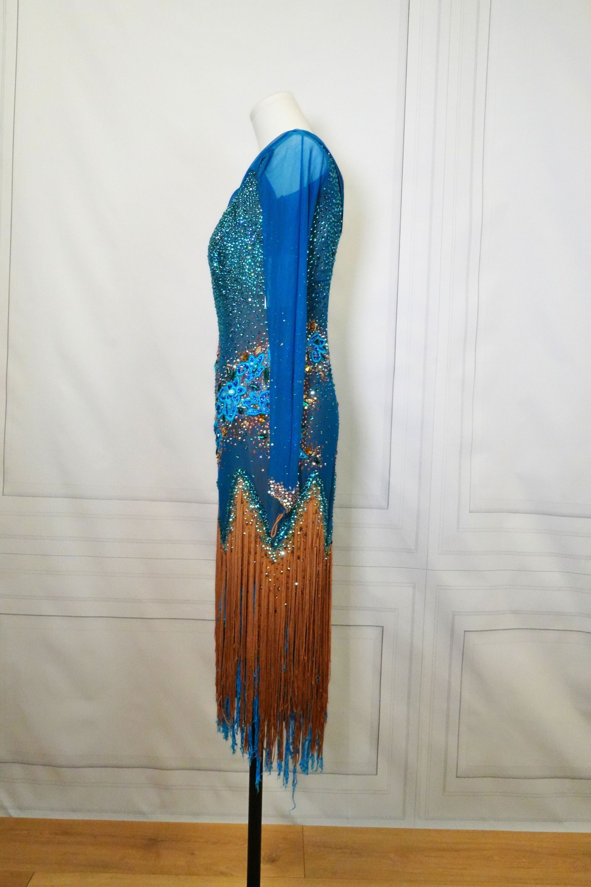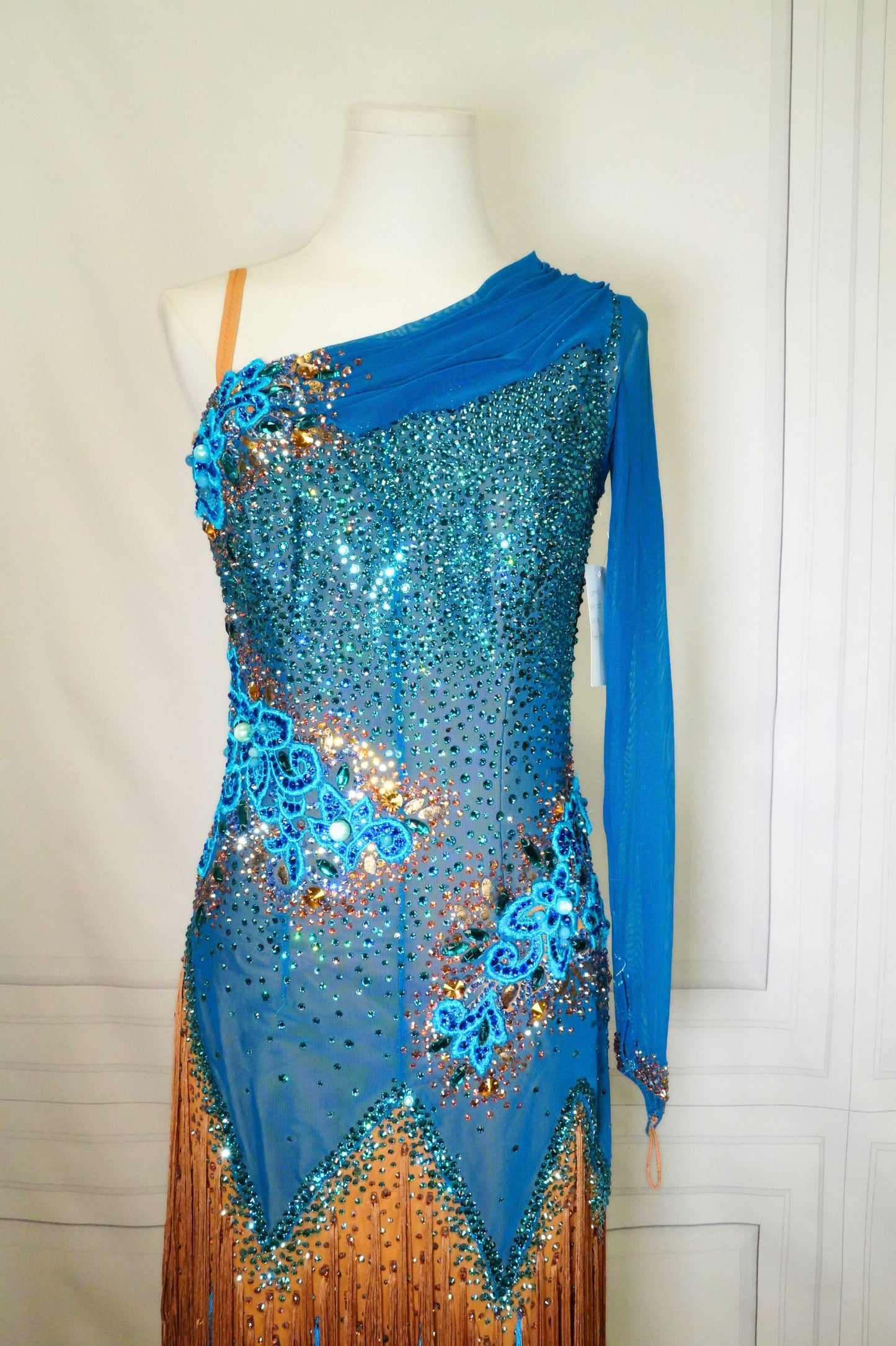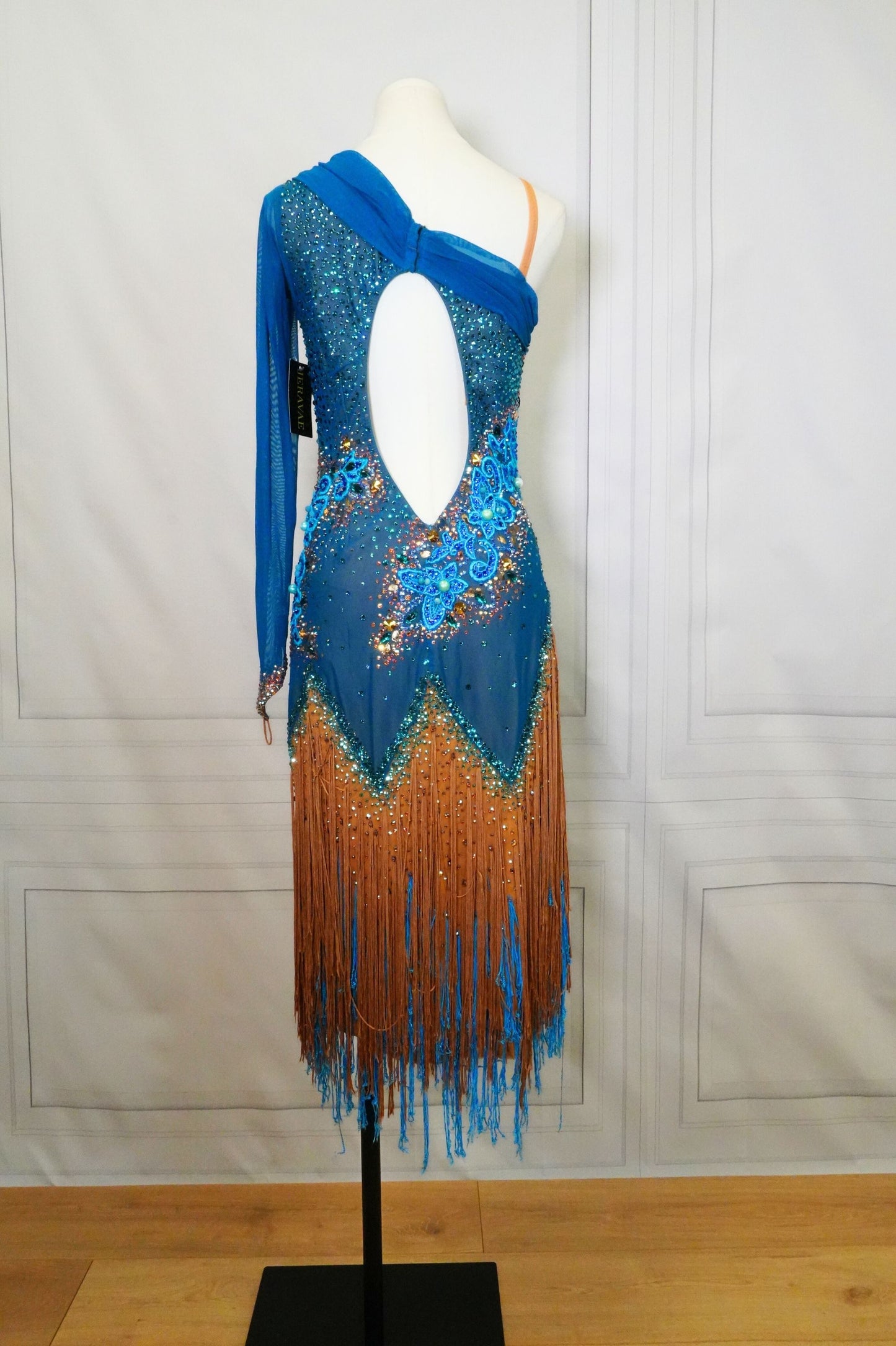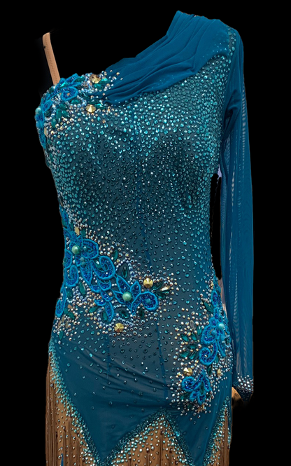 Resale Artistry in Motion Indicolite Latin Dress with Cappuccino Fringe, One Long Sleeve, and Keyhole Back Size Medium Lat149