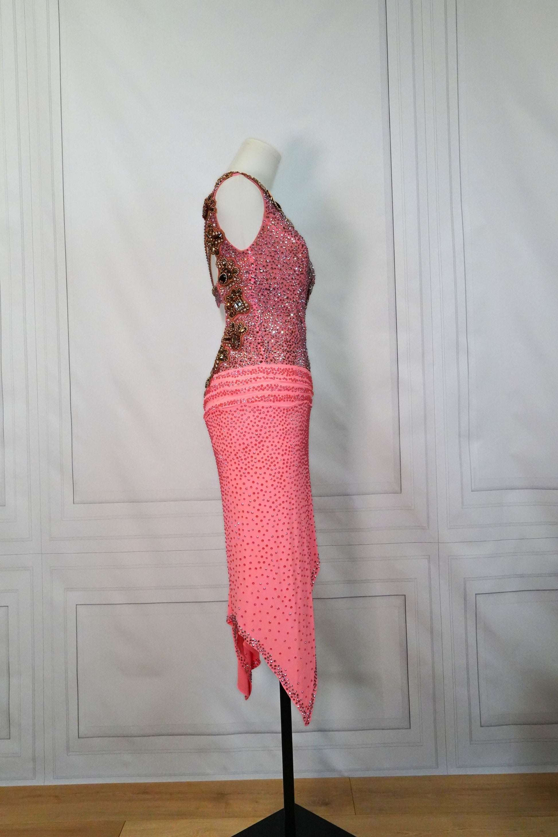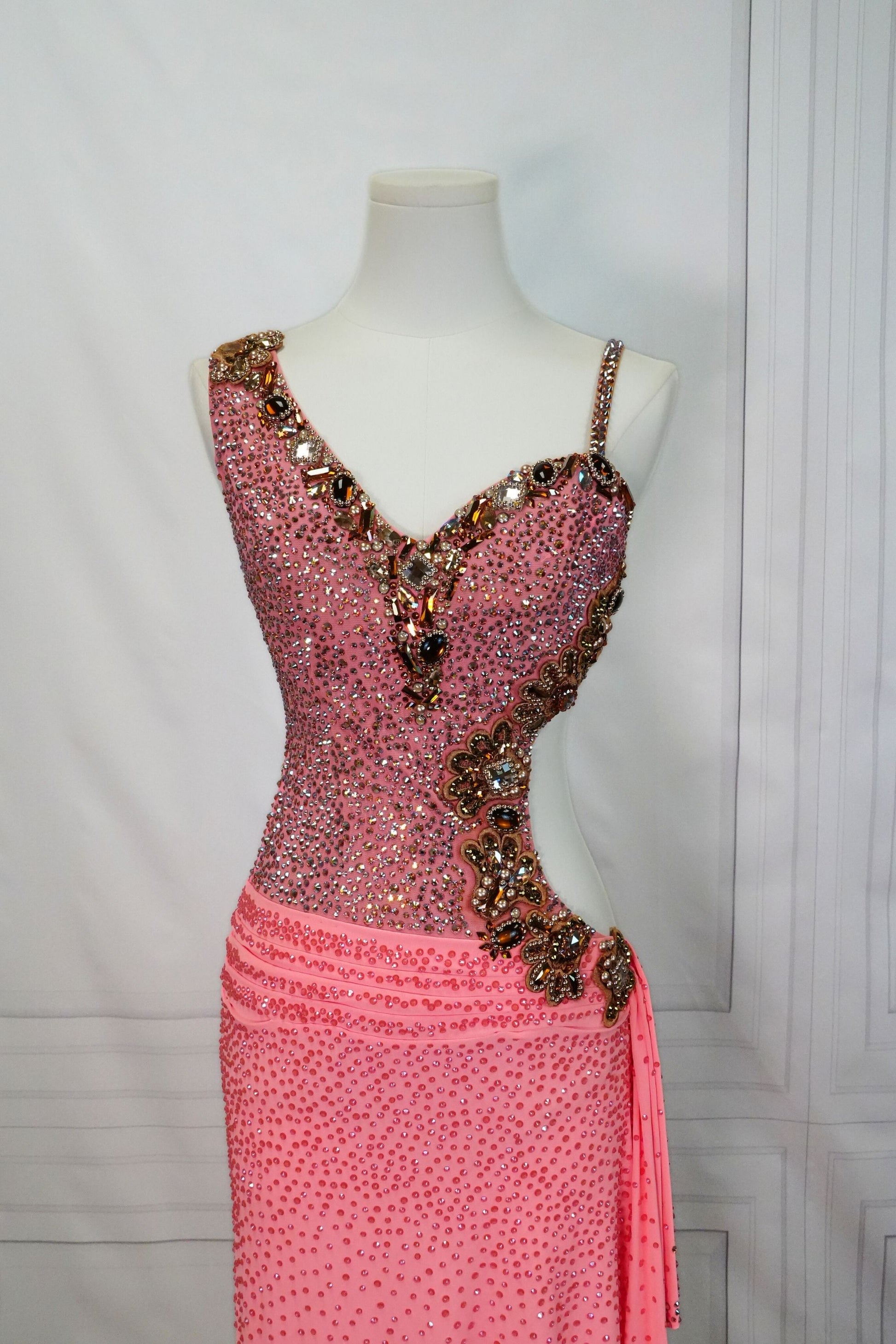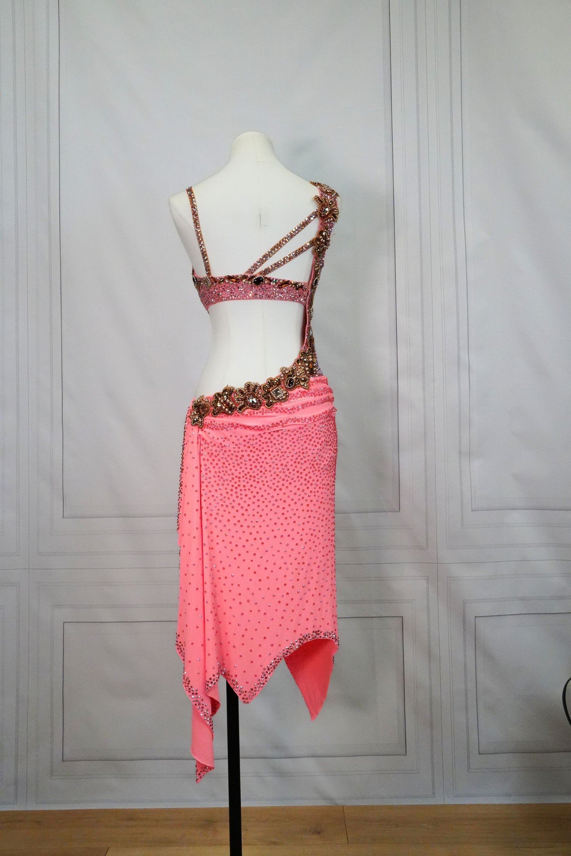 Resale Artistry in Motion Light Coral Latin Dress with Brown Lace Appliqué, Rouching at Hips, and Side Cut Out Size Small Lat225