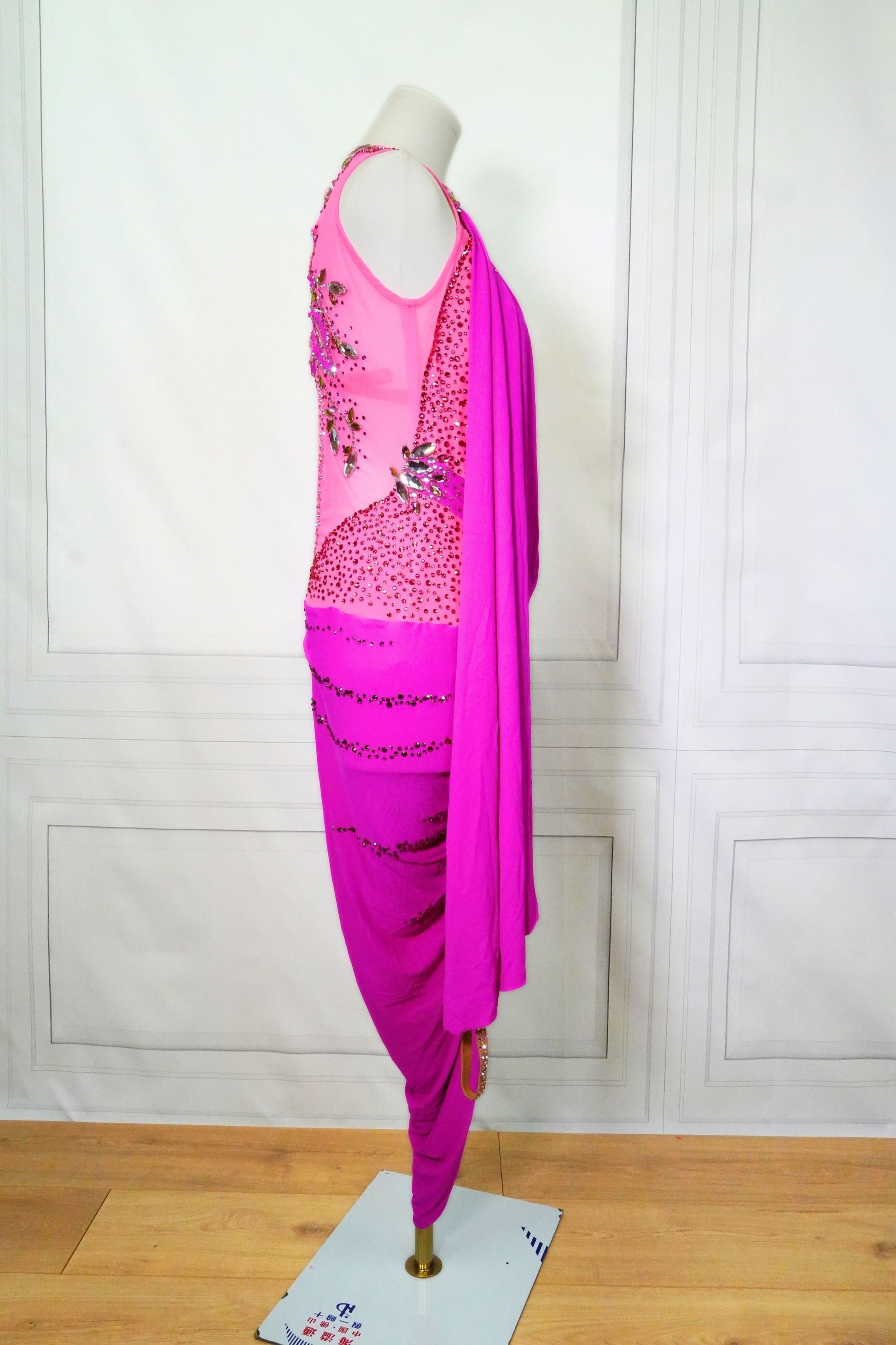 Resale Artistry in Motion Pink Draped Latin Dress with Crystal Stones, Mesh Illusion Neckline, and One Loose Sash Sleeve Size Medium/ Large Lat231
