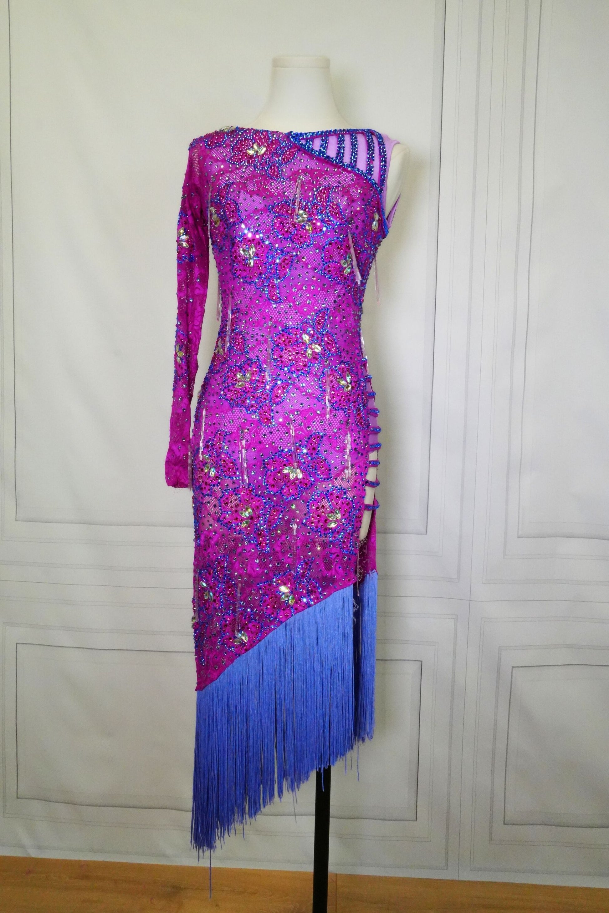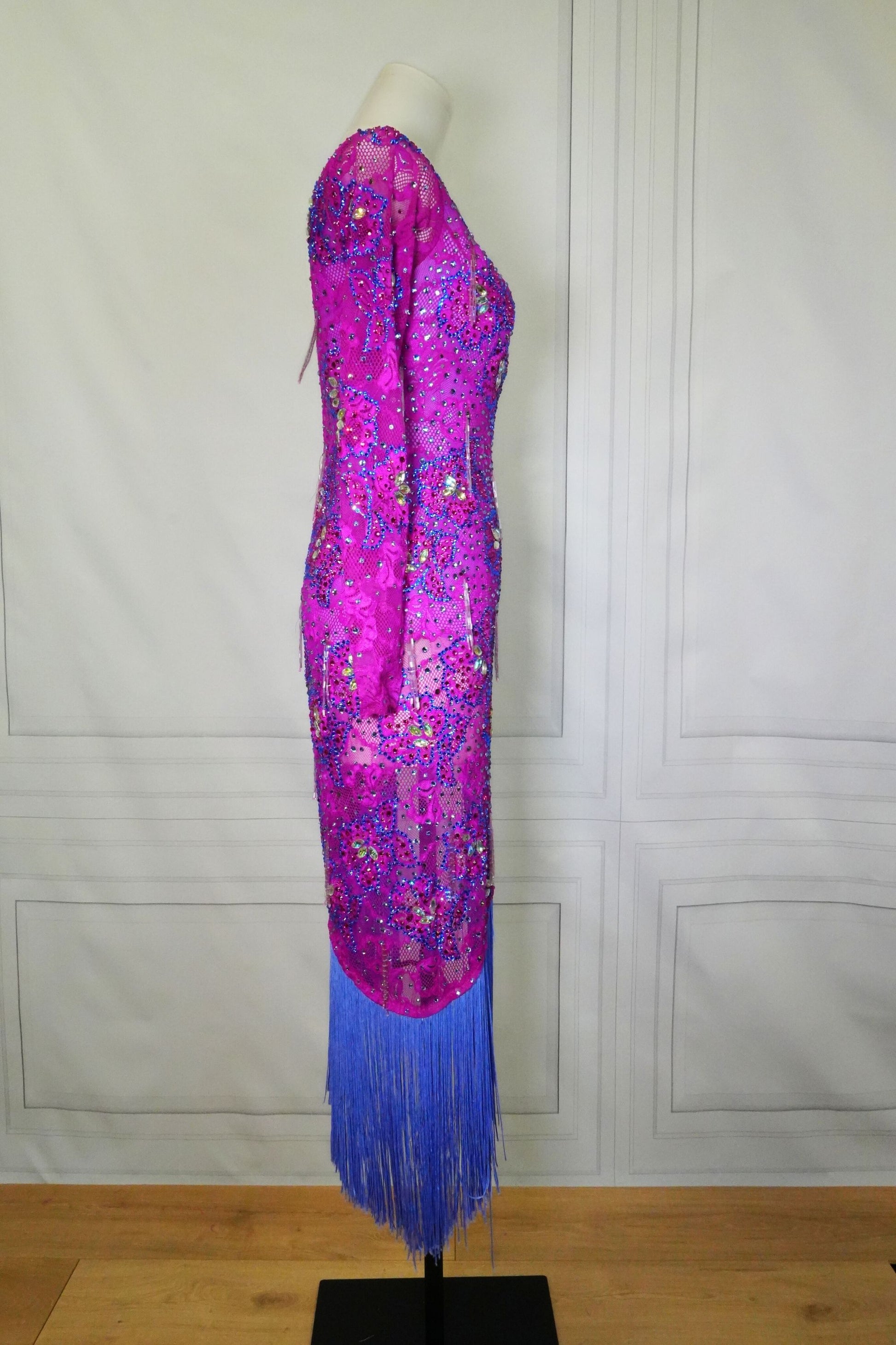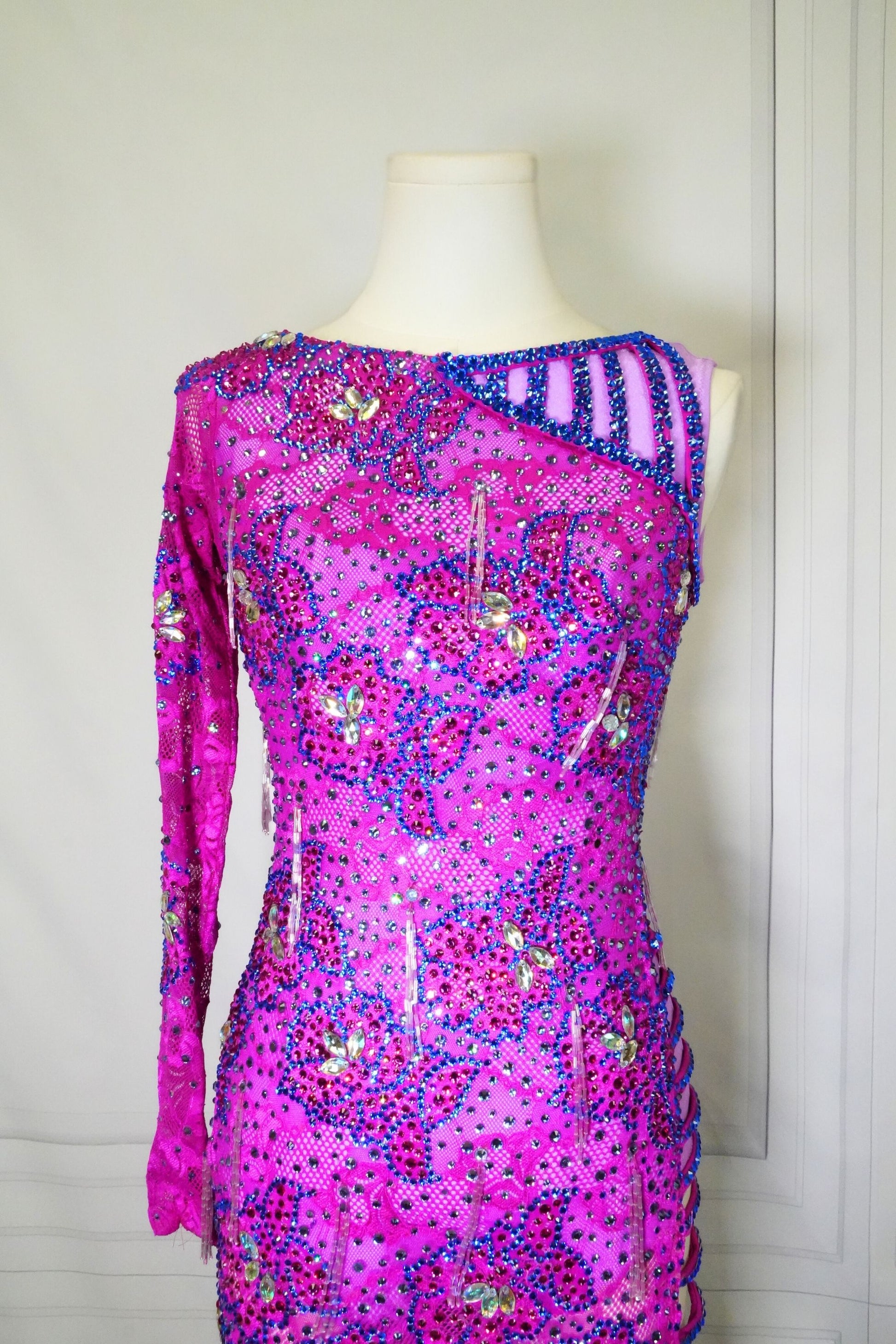 Resale Artistry in Motion Pink Stretch Lace Latin Dress with Single Sleeve, Lilac Fringe, Swarovski Stones, and Bugle Bead Tassels Size Small Lat126