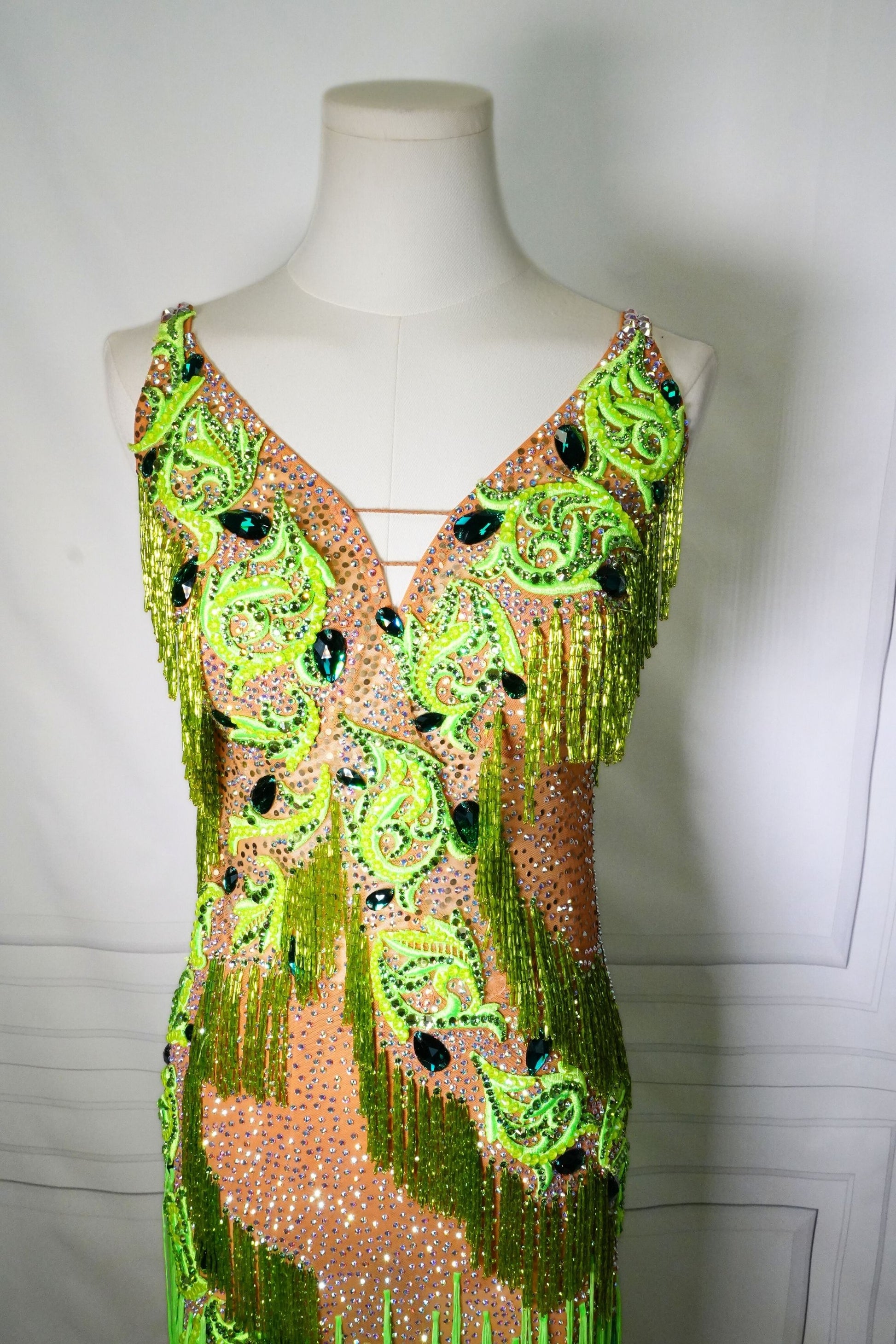 Resale Artistry in Motion Sleeveless Nude Mesh Latin Dress with Lime Green Lace Appliqué, Bugle Beads, and Fringe Size Small Lat234