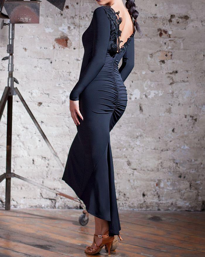 This dress has rouching and sequin lace detail on the back, long solid sleeves and slit skirt.