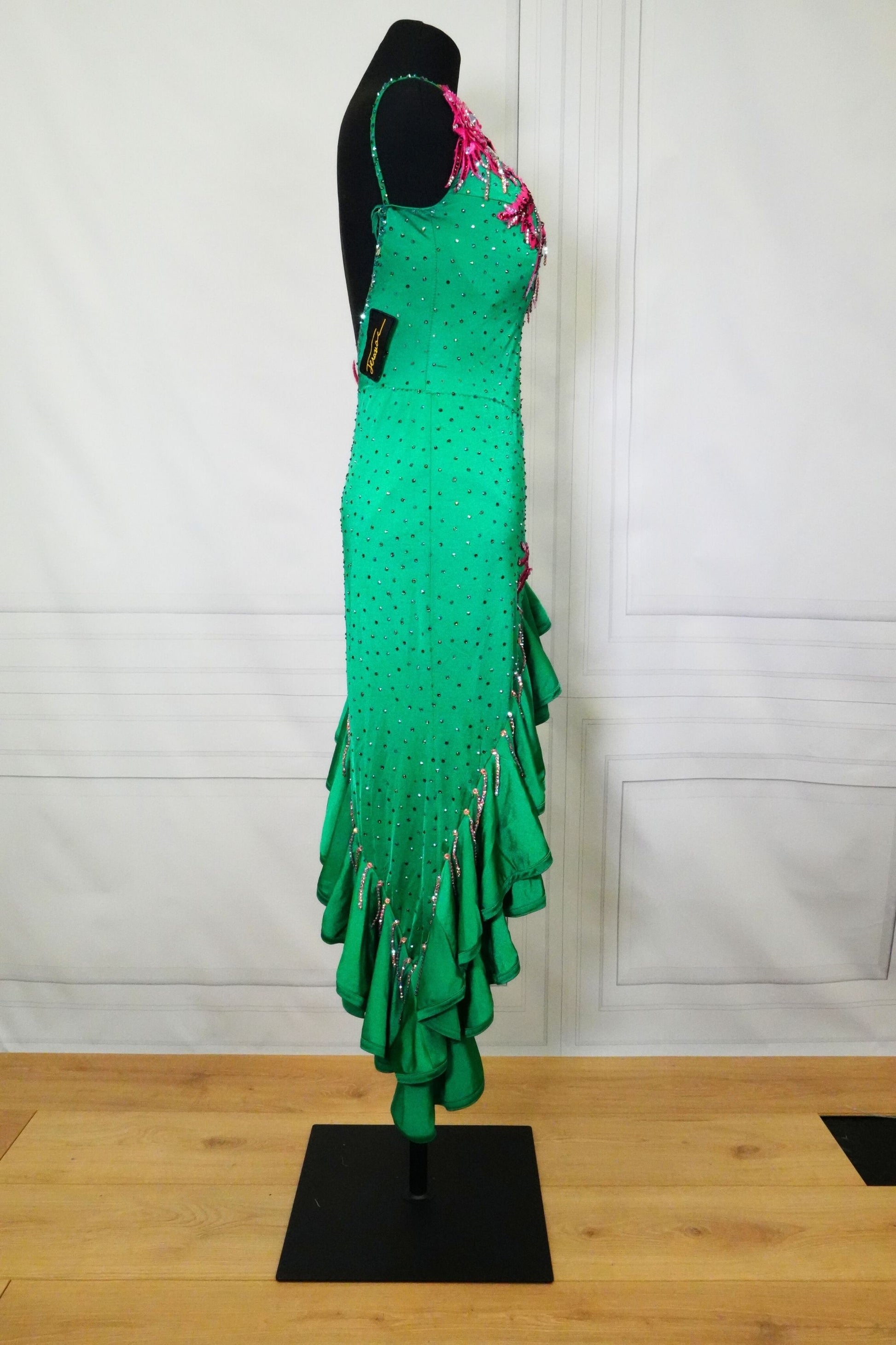Sleeveless Green and Nude Latin Dress with Open Back, Ruffle Skirt with Angle Cut, Swarovski Stones, and Pink Lace Appliques in Floral Design Size Small Lat143