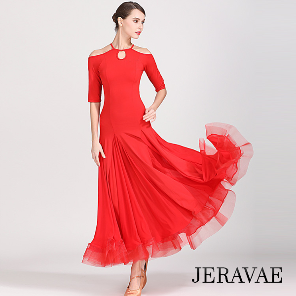 - This ballroom dress has an exposed horsehair hem and is made of Lycra.