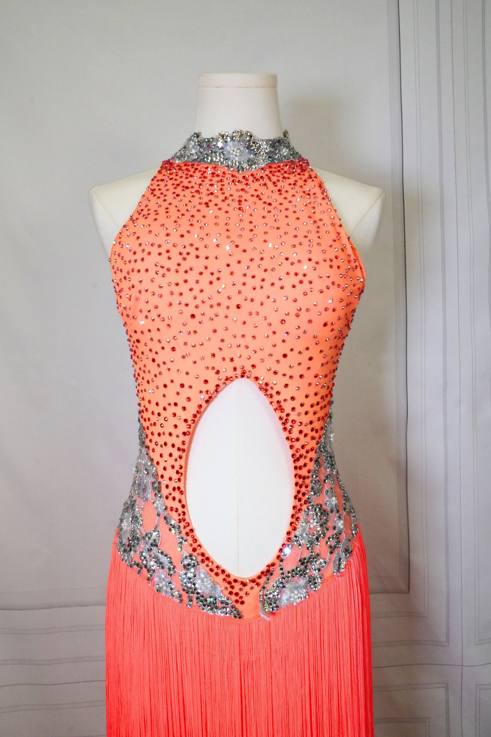Bright Neon Orange and Gray Latin Dress with Orange Fringe and Long Skirt Size Extra Small Lat102