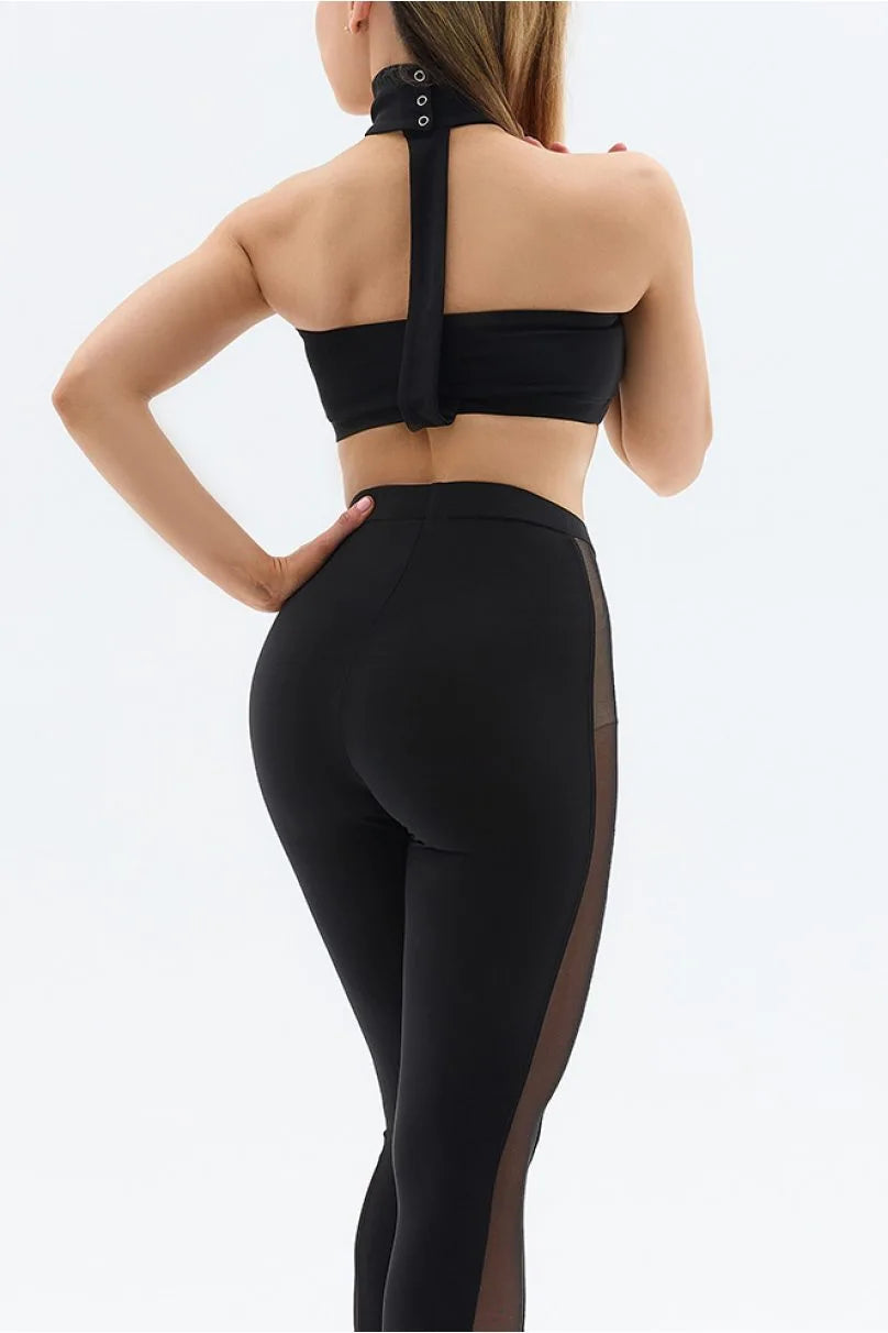 Stylish crop top designed for dancing featuring a unique look. This model has a vertical back detail that transforms into a stand-up collar with a button fastening.