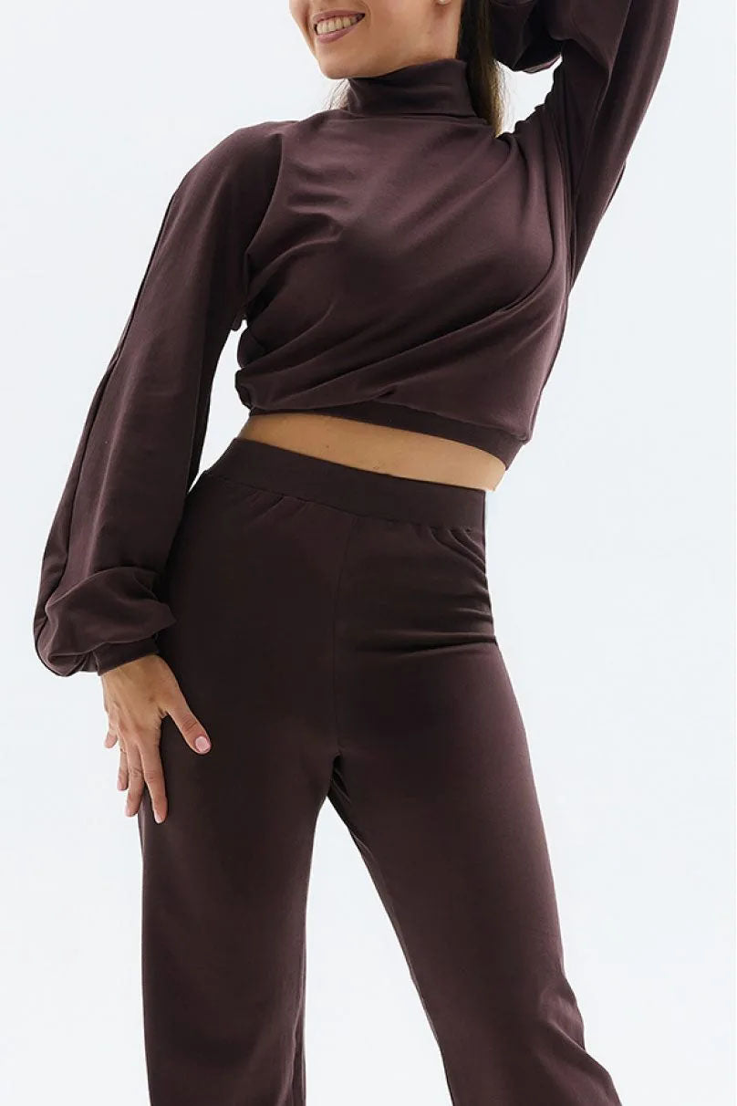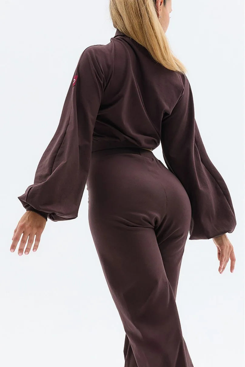 Latin dance top designed for comfort and freedom of movement. This loose-fitting long-sleeve top is made from soft jersey, complemented by ribbed jersey details at the sleeve cuffs, stand-up collar, and waistband. The waistband includes a 3 cm wide elastic band for a secure and flexible fit.
