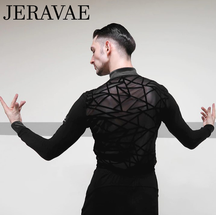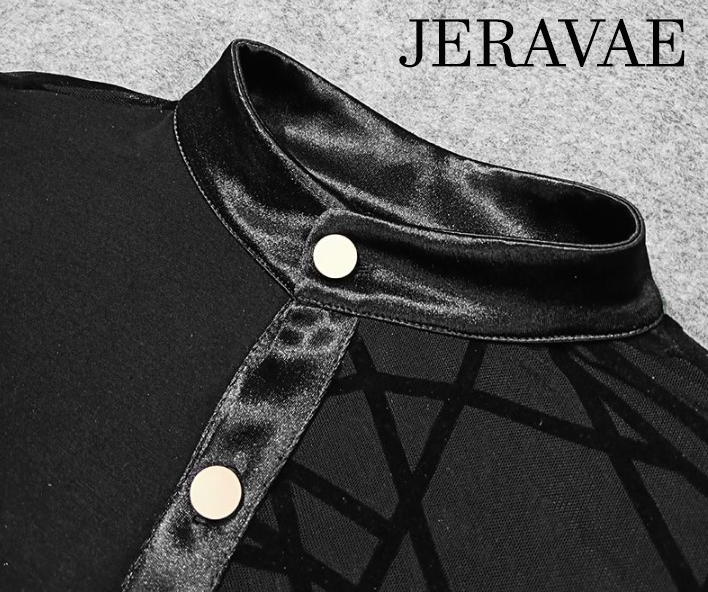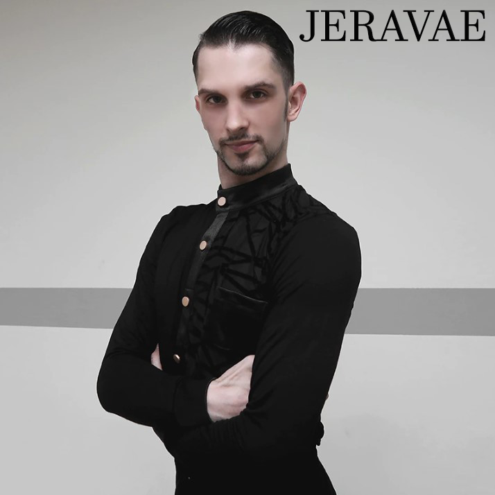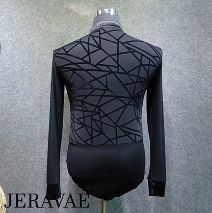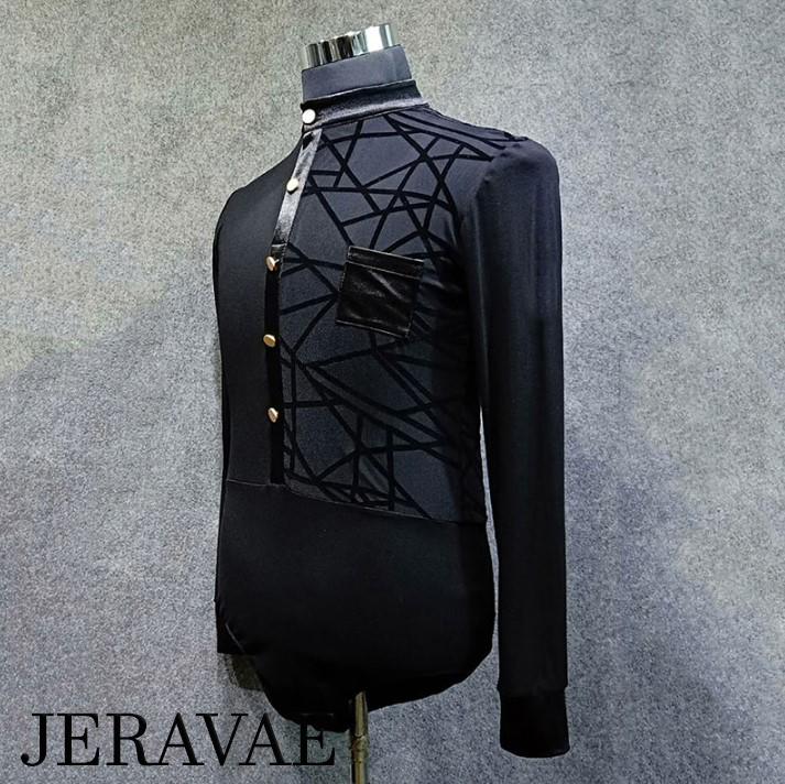 Men's Black Bodysuit with Mandarin Collar, Gold Buttons, and Mesh on Side and Back with Velvet Geometric Pattern M065 in Stock