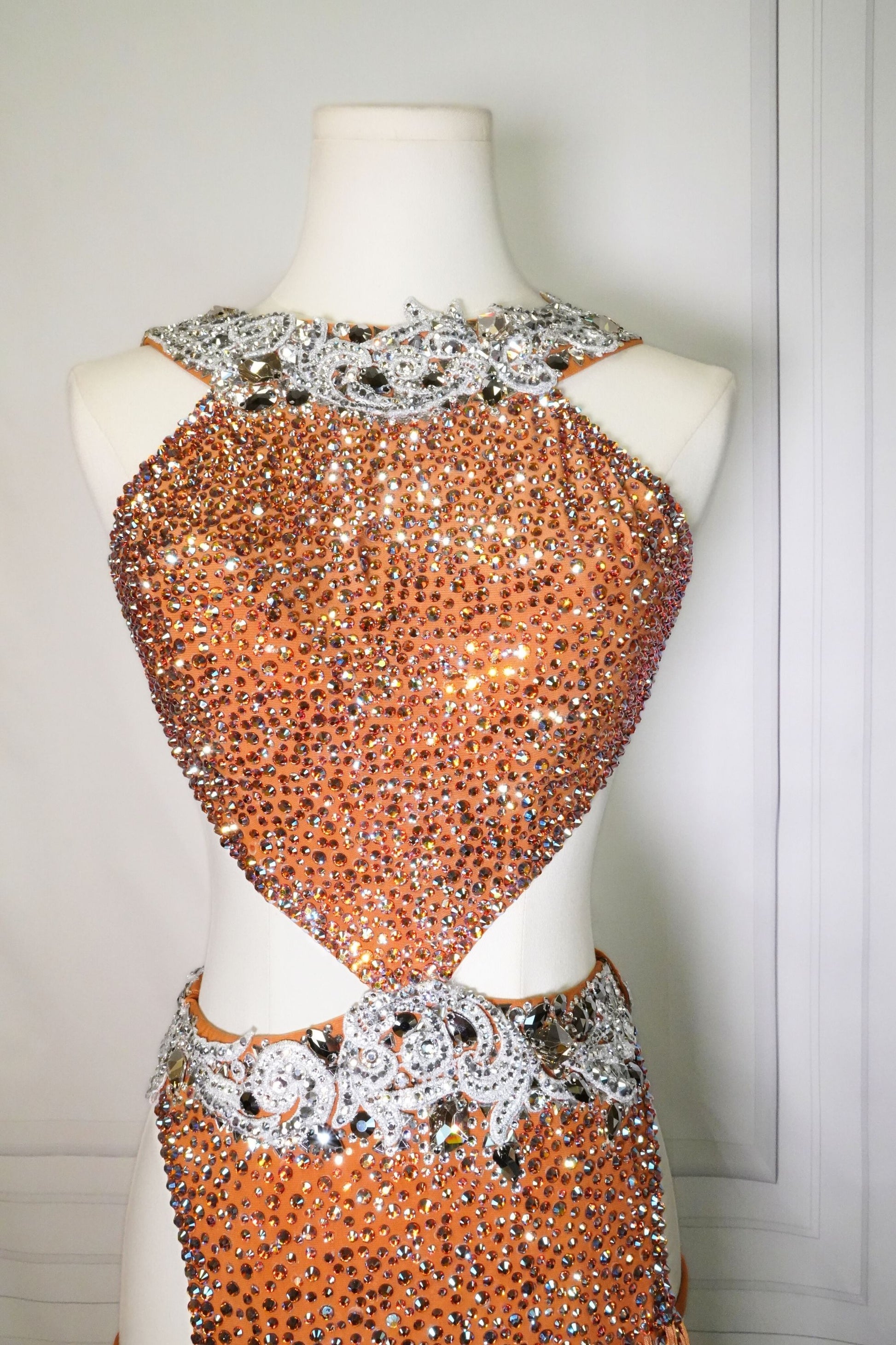Resale Artistry in Motion Cappuccino Latin Dress with Fringe Hem, Silver Lace Applique, and Open Sides and Back Size Small Lat164
