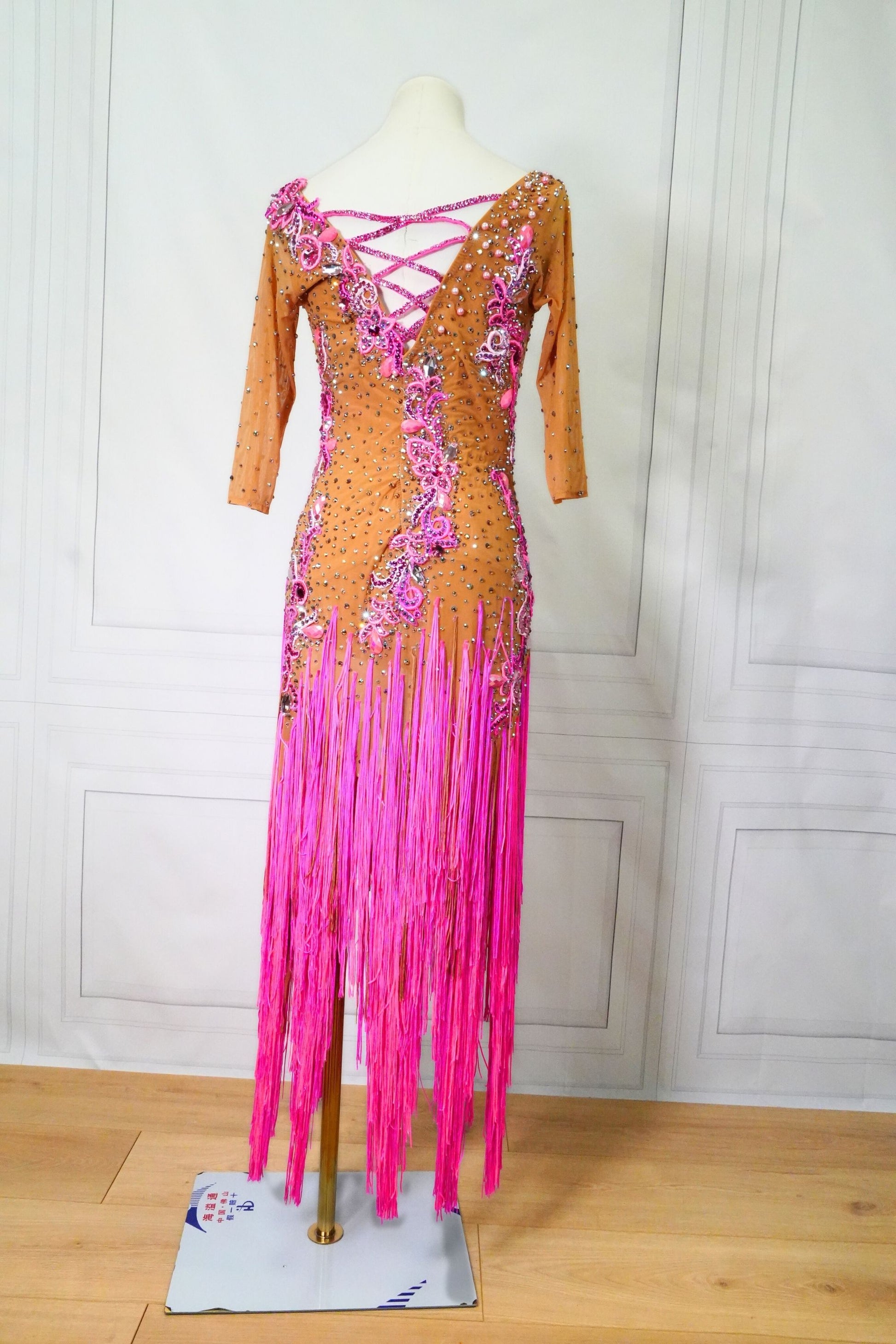 Resale Artistry in Motion Tan Latin Dress with Pink Fringe Skirt, Pink Lace Appliqué, and Cross Straps Size Large Lat233