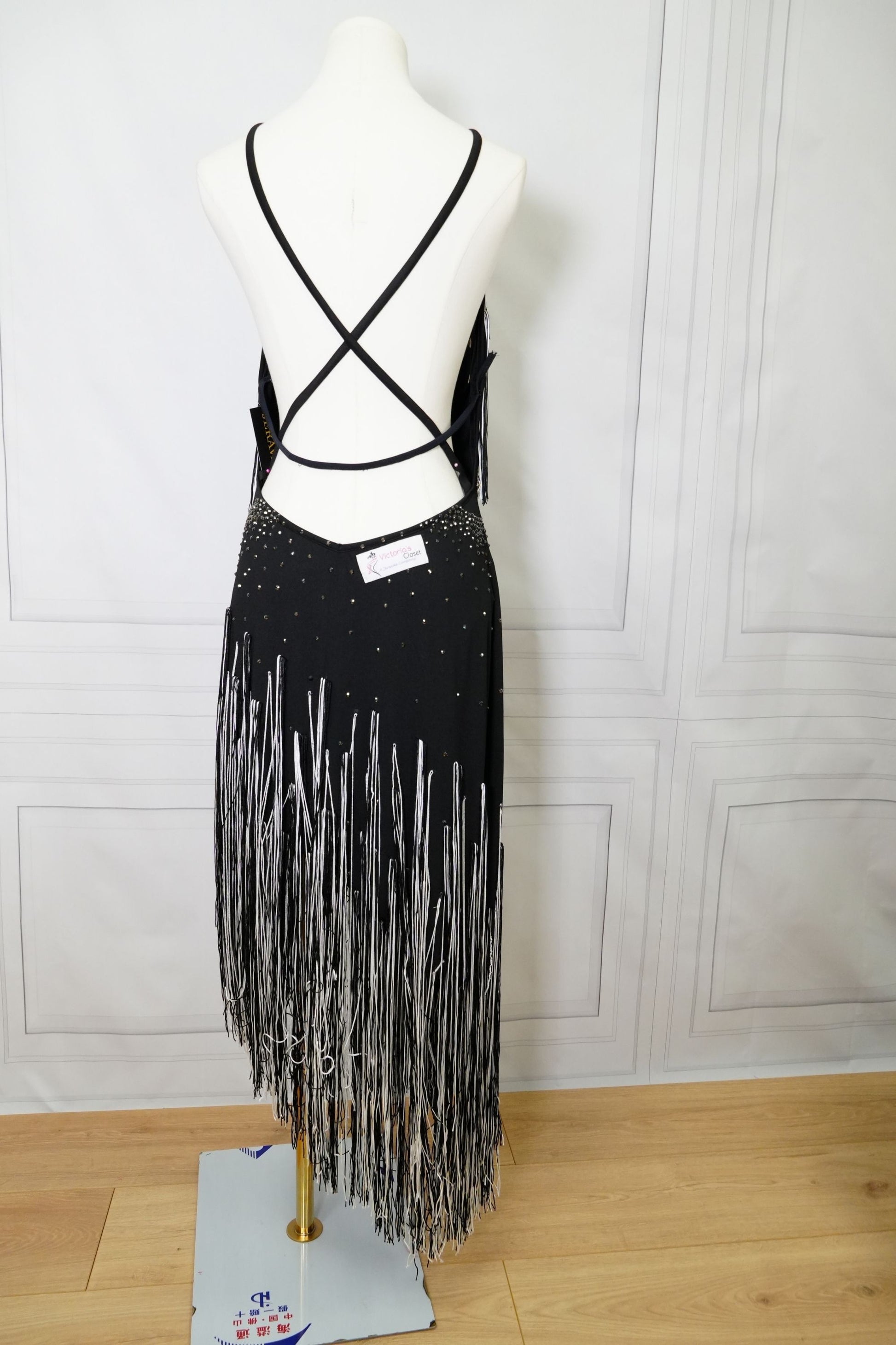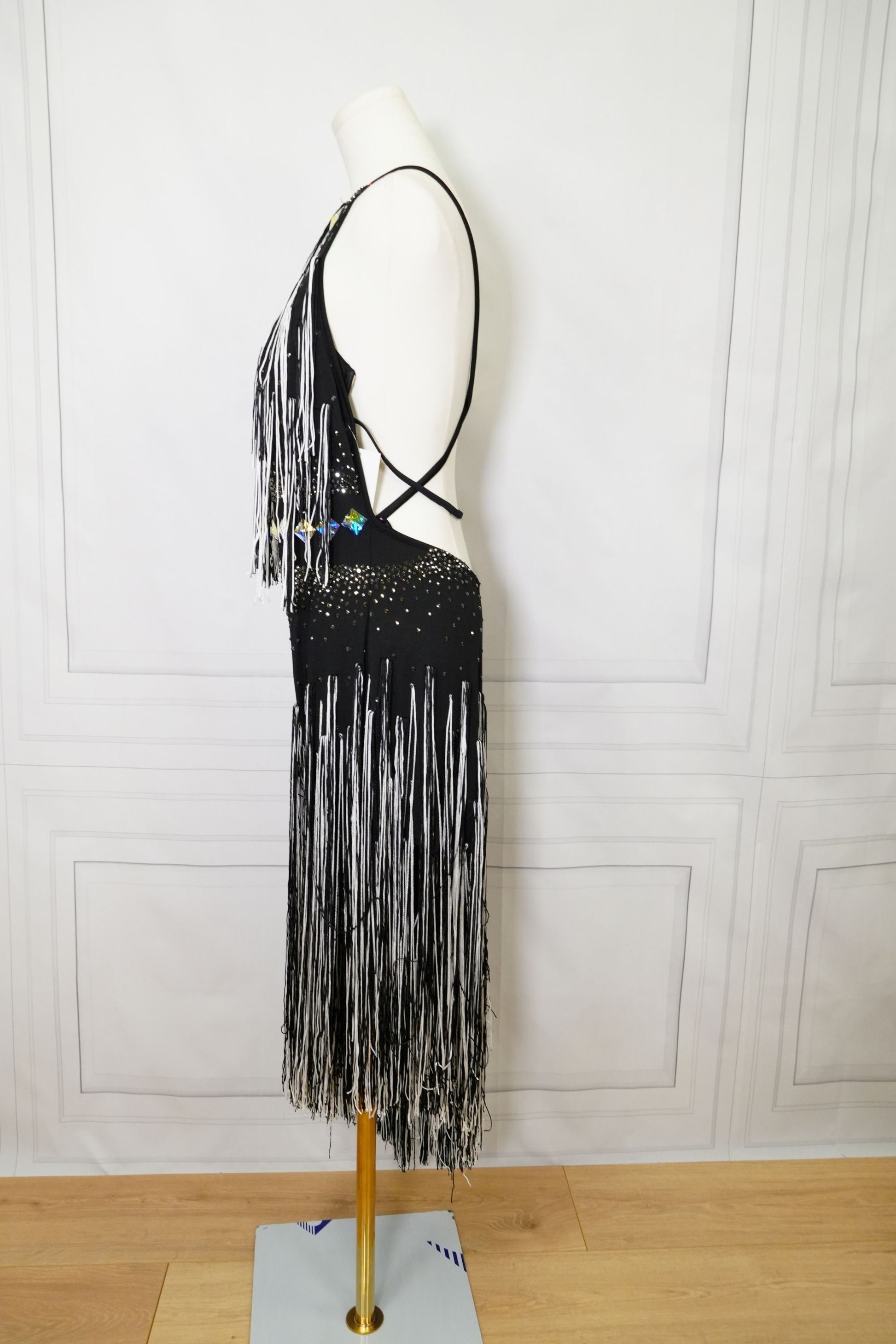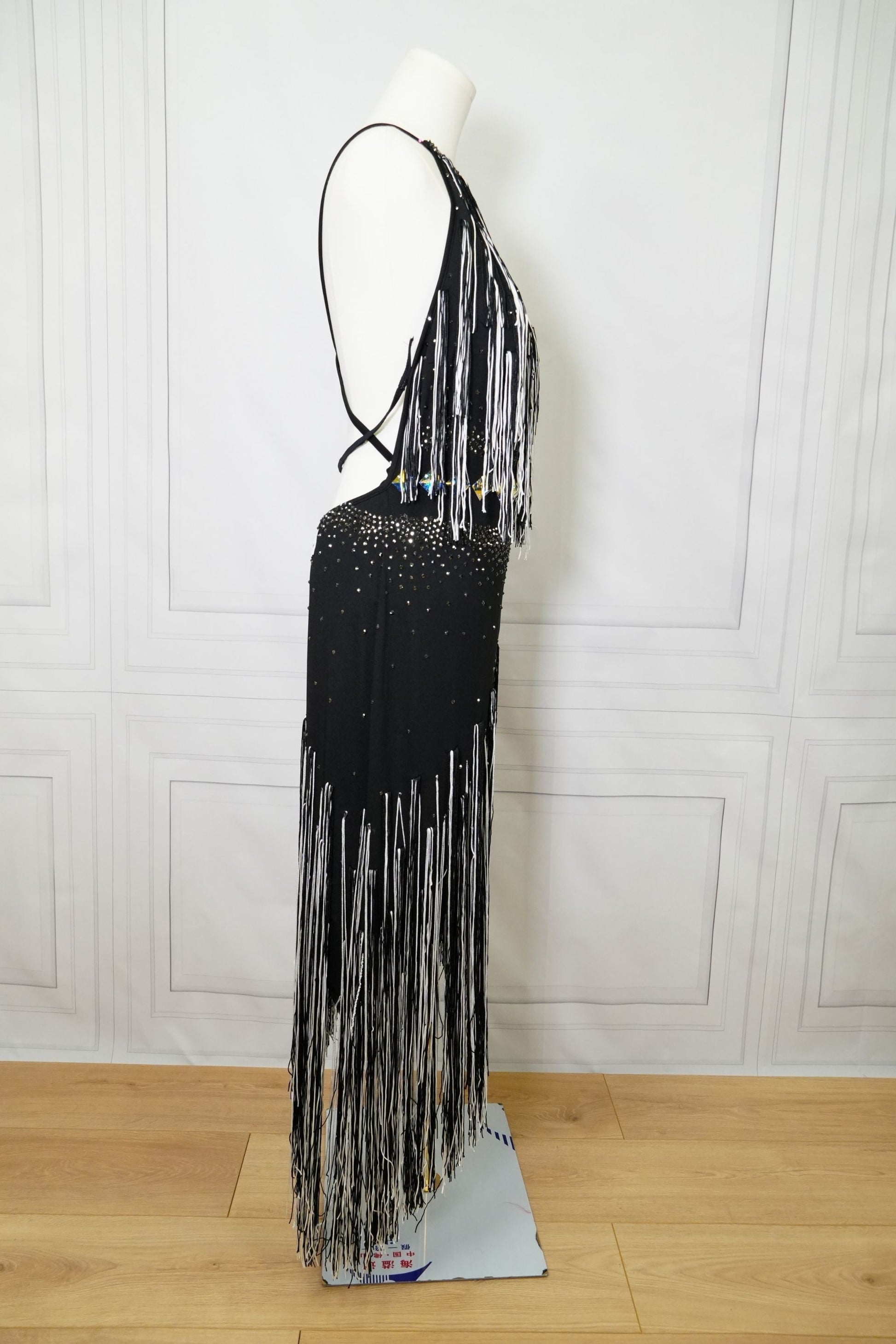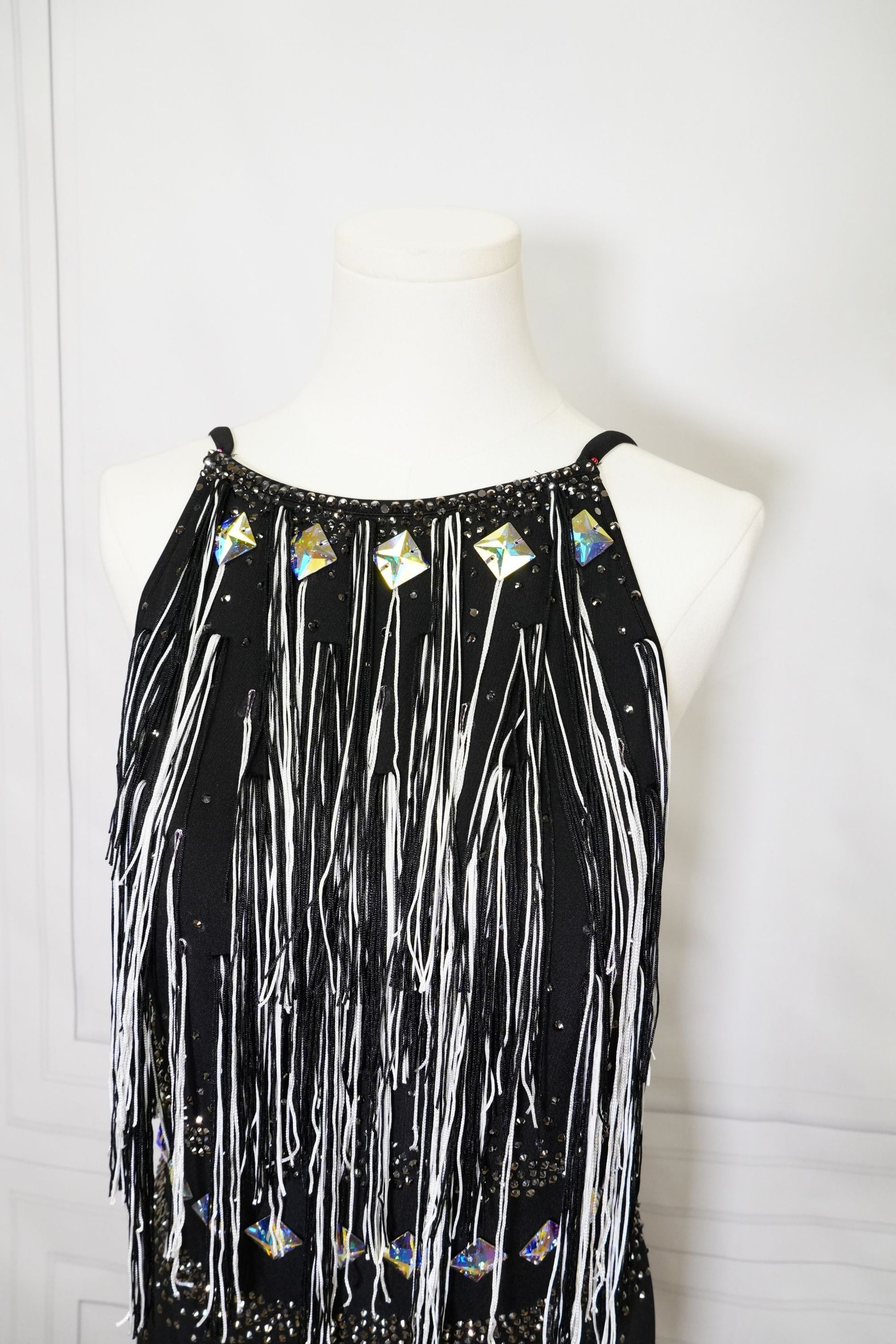Sleeveless Black Latin Dress with Long Black and White Fringe, Stoning Details, and Bare Back Size Large Lat218