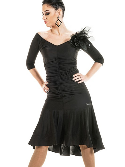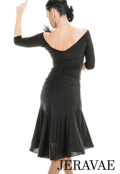 Victoria Blitz LA019 Black V-Neck Latin Practice Dress with Rouching, Half Sleeves, and Mesh Decoration PRA 995 in Stock