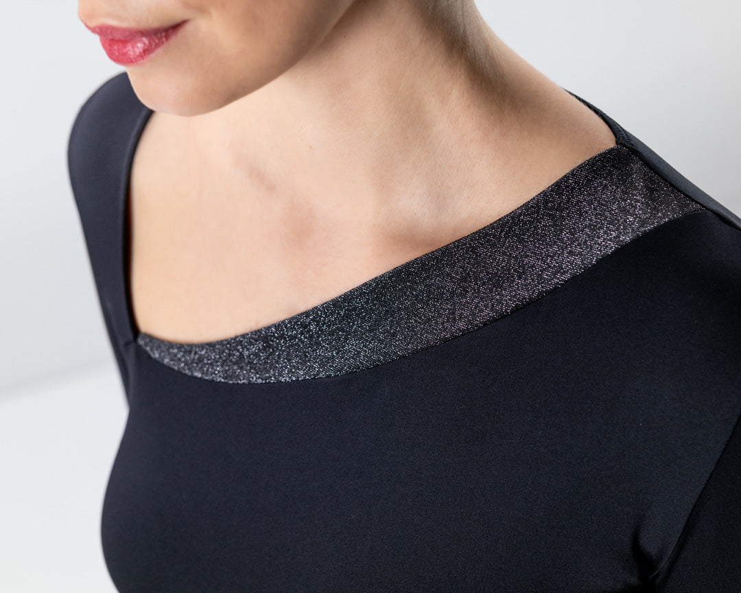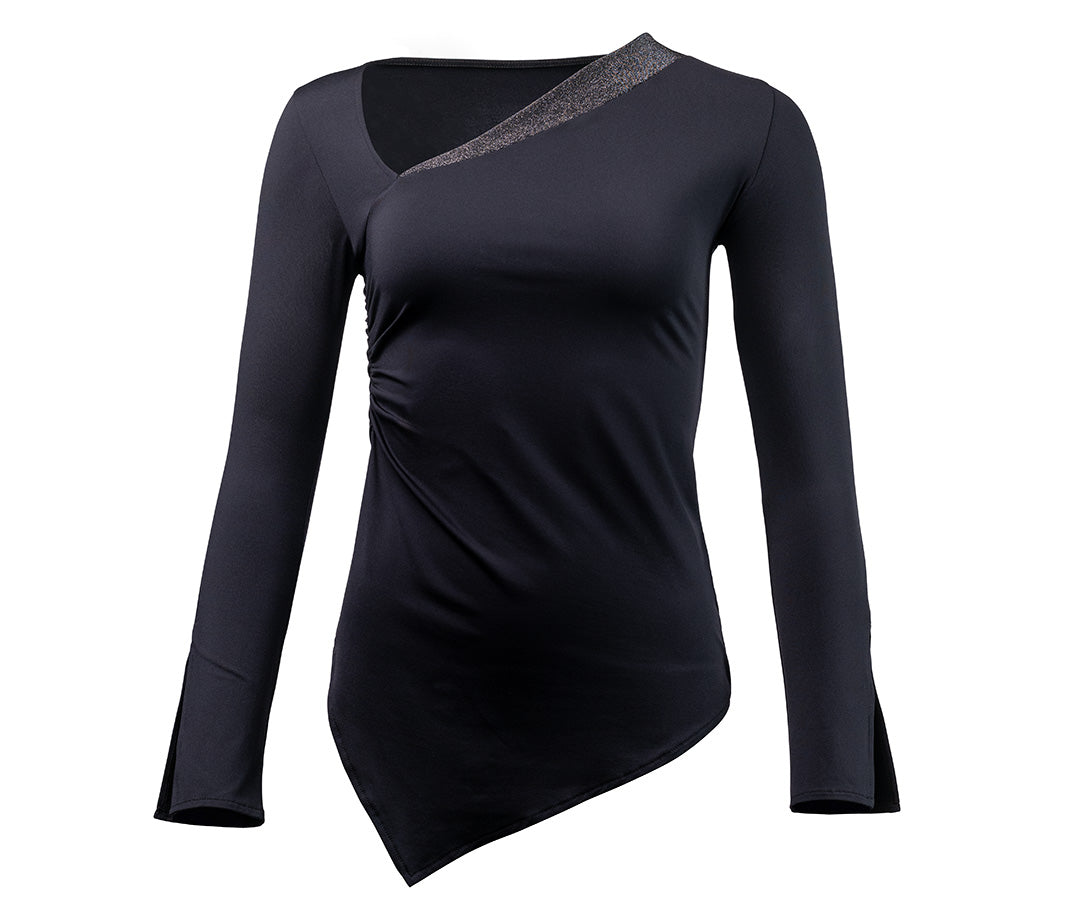 Women's dance top Rida in black – with asymmetrical neckline and stretch fabric. Our soft, long-sleeved dance top in classic black impresses with its simple cut and refined details. An asymmetrical neckline, sleeve slits, and a diagonally shaped hem create a distinctive look. The neckline is trimmed at the front with a subtly shiny edging, adding a touch of noble elegance to the black dance top. The fine elastic fabric offers optimal freedom of movement and gently hugs the body – perfect for training sessions and passionate dance evenings.